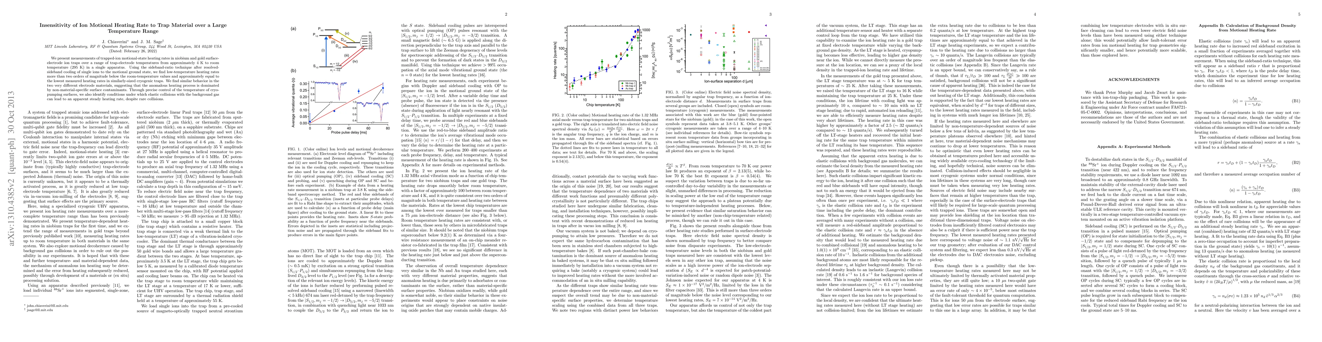 This study measures the motional heating rates of trapped ions in niobium and gold surface-electrode ion traps over a wide temperature range, finding that heating rates are insensitive to trap material and dominated by non-material-specific surface contaminants. The heating rates are significantly lower at low temperatures compared to room temperature.