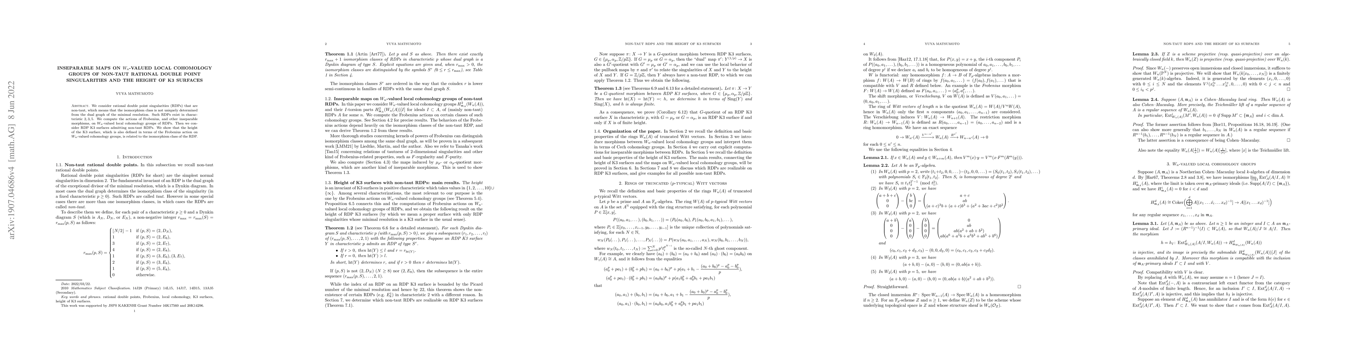 This paper studies non-taut rational double point singularities in characteristics 2, 3, and 5, analyzing the actions of Frobenius and other inseparable morphisms on their $W_n$-valued local cohomology groups. It also explores the relationship between the height of K3 surfaces with these singularities and the isomorphism class of the singularities.