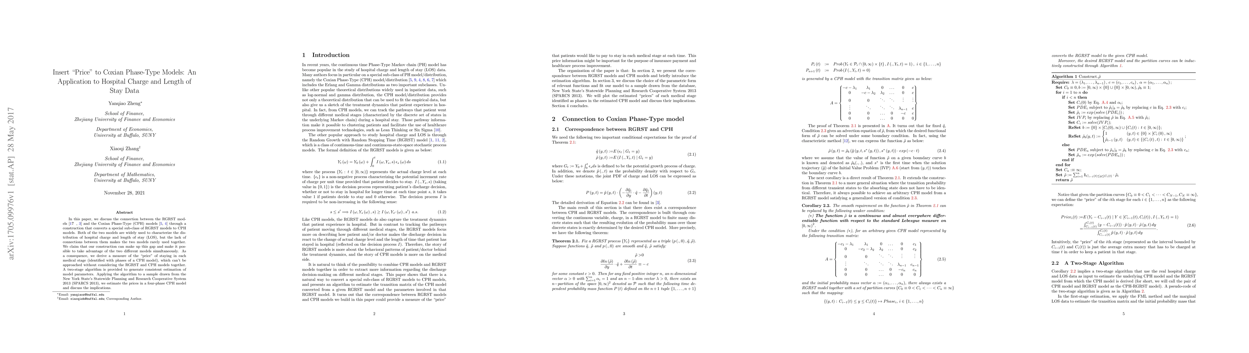 In this paper, we discuss the connection between the RGRST models (Gardiner et al 2002, Polverejan et al 2003) and the Coxian Phase-Type (CPH) models (Marshall et al 2007, Tang 2012) through a construction that converts a special sub-class of RGRST models to CPH models. Both of the two models are widely used to characterize the distribution of hospital charge and length of stay (LOS), but the lack of connections between them makes the two models rarely used together. We claim that our construction can make up this gap and make it possible to take advantage of the two different models simultaneously. As a consequence, we derive a measure of the "price" of staying in each medical stage (identified with phases of a CPH model), which can't be approached without considering the RGRST and CPH models together.A two-stage algorithm is provided to generate consistent estimation of model parameters. Applying the algorithm to a sample drawn from the New York State's Statewide Planning and Research Cooperative System 2013 (SPARCS 2013), we estimate the prices in a four-phase CPH model and discuss the implications.