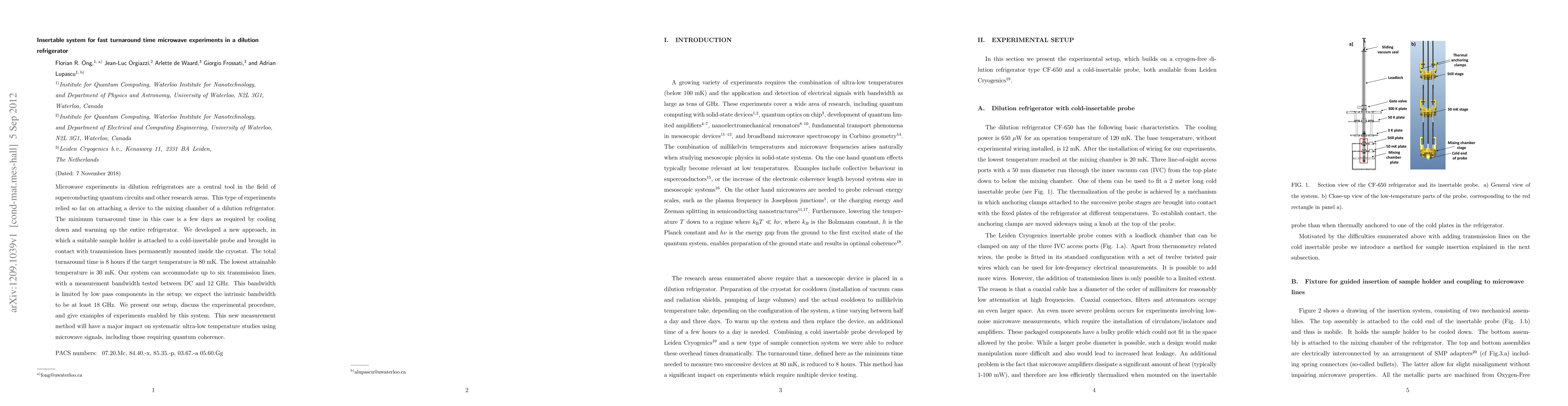 The paper introduces a novel insertable system that reduces microwave experiment turnaround time in dilution refrigerators from days to 8 hours at 80 mK, enabling up to six transmission lines with a tested bandwidth from DC to 12 GHz, with potential intrinsic bandwidth of at least 18 GHz. This setup significantly enhances the efficiency of ultra-low temperature studies, especially for quantum coherence experiments.