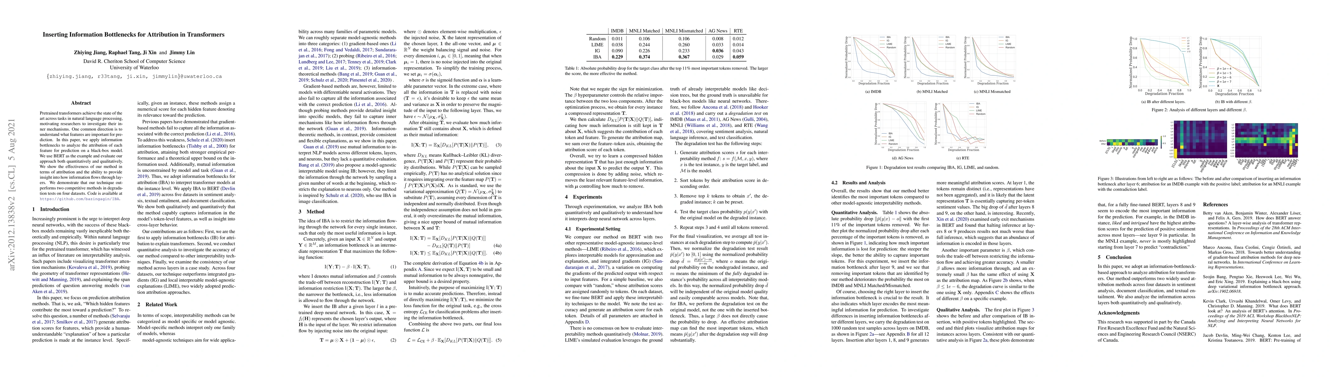 Pretrained transformers achieve the state of the art across tasks in natural language processing, motivating researchers to investigate their inner mechanisms. One common direction is to understand what features are important for prediction. In this paper, we apply information bottlenecks to analyze the attribution of each feature for prediction on a black-box model. We use BERT as the example and evaluate our approach both quantitatively and qualitatively. We show the effectiveness of our method in terms of attribution and the ability to provide insight into how information flows through layers. We demonstrate that our technique outperforms two competitive methods in degradation tests on four datasets. Code is available at https://github.com/bazingagin/IBA.