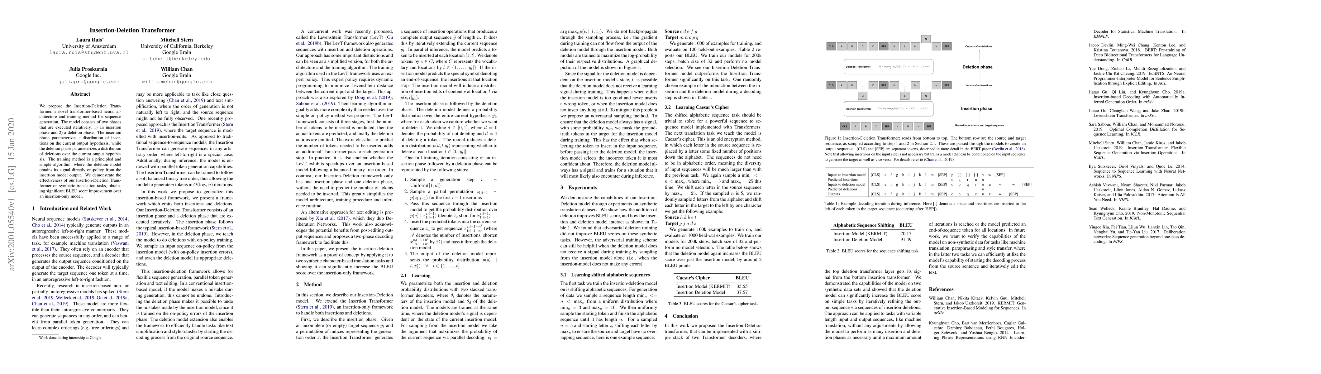 The Insertion-Deletion Transformer is a novel transformer architecture that alternates between insertion and deletion phases to improve sequence generation. This method shows significant BLEU score gains over insertion-only models in synthetic translation tasks.