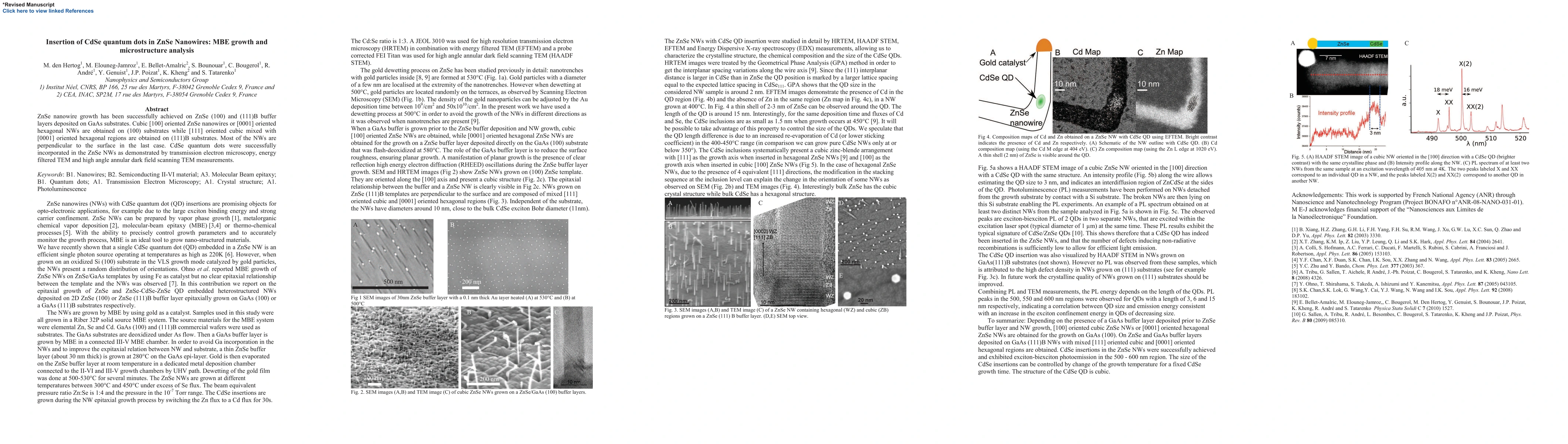 This paper reports the successful growth of ZnSe nanowires on ZnSe buffer layers on GaAs substrates using molecular beam epitaxy, with distinct orientations on different substrates. CdSe quantum dots were incorporated into the ZnSe nanowires, confirmed through advanced microscopy techniques.
