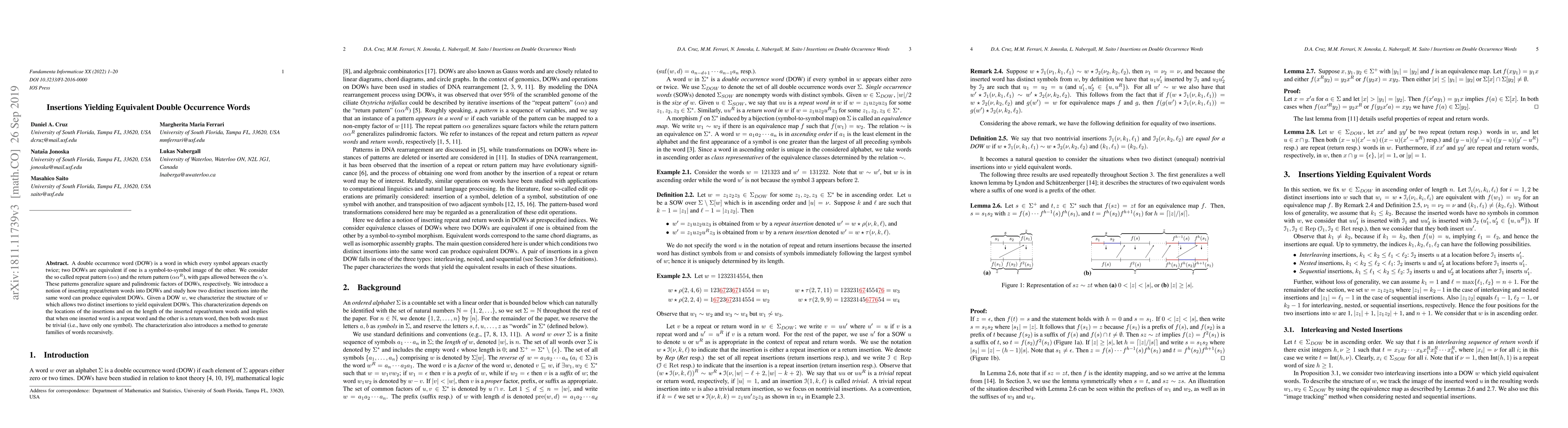 A double occurrence word (DOW) is a word in which every symbol appears exactly twice; two DOWs are equivalent if one is a symbol-to-symbol image of the other. We consider the so called repeat pattern ($\alpha\alpha$) and the return pattern ($\alpha\alpha^R$), with gaps allowed between the $\alpha$'s. These patterns generalize square and palindromic factors of DOWs, respectively. We introduce a notion of inserting repeat/return words into DOWs and study how two distinct insertions into the same word can produce equivalent DOWs. Given a DOW $w$, we characterize the structure of $w$ which allows two distinct insertions to yield equivalent DOWs. This characterization depends on the locations of the insertions and on the length of the inserted repeat/return words and implies that when one inserted word is a repeat word and the other is a return word, then both words must be trivial (i.e., have only one symbol). The characterization also introduces a method to generate families of words recursively.