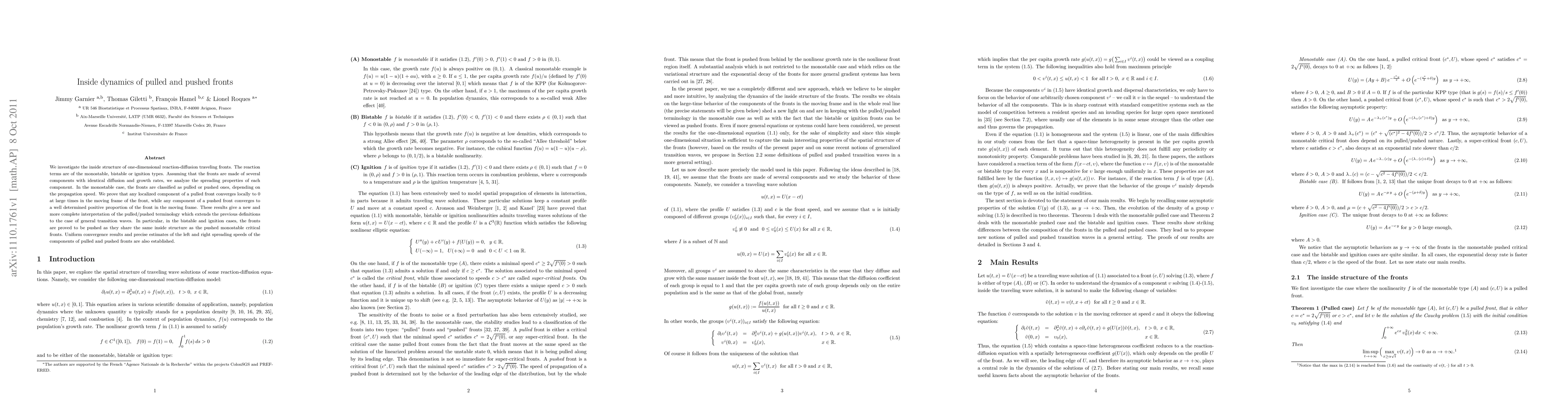 This paper examines the internal dynamics of one-dimensional reaction-diffusion traveling fronts, classifying them as pulled or pushed based on their propagation speed. It proves that components of pulled fronts converge to zero, while those of pushed fronts converge to a positive proportion, providing a refined interpretation of the terminology and extending these concepts to bistable and ignition cases.