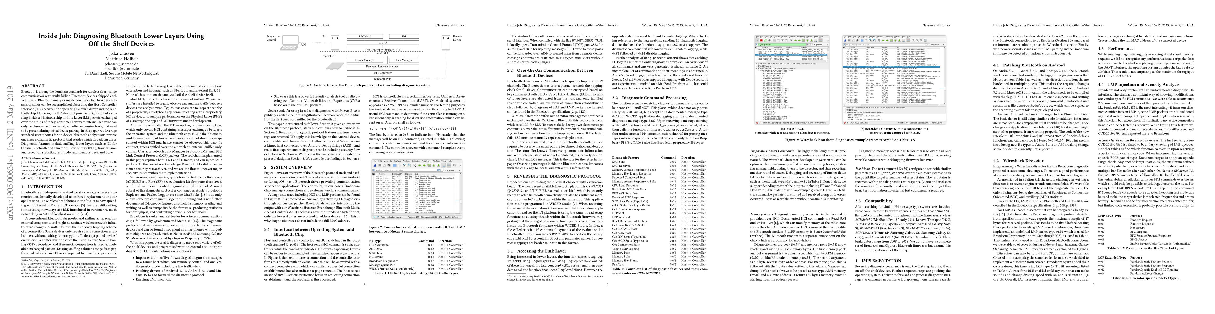 This paper explores using standard smartphones to diagnose Bluetooth lower layers within consumer hardware by reverse engineering a diagnostic protocol in Broadcom chips, enabling insights into Link Layer packets and internal Bluetooth chip tasks without expensive external tools. The diagnostic protocol allows for sniffing, statistics, test mode, and memory access.
