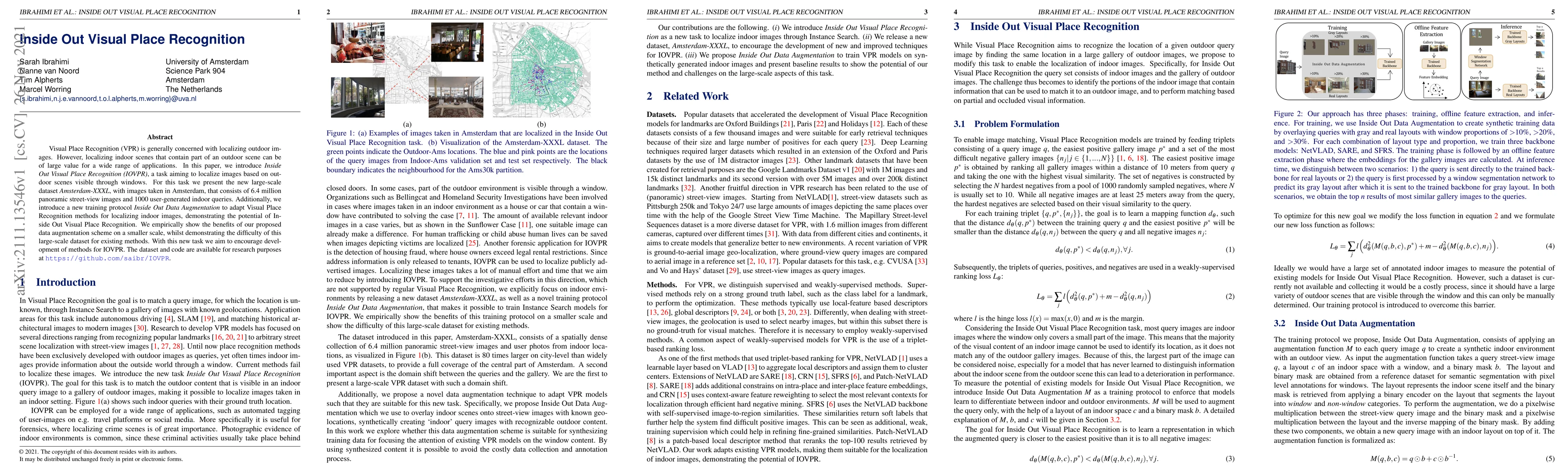 The paper introduces Inside Out Data Augmentation protocol and a large-scale dataset, Amsterdam-XXXL, to train and evaluate the IOVPR task.