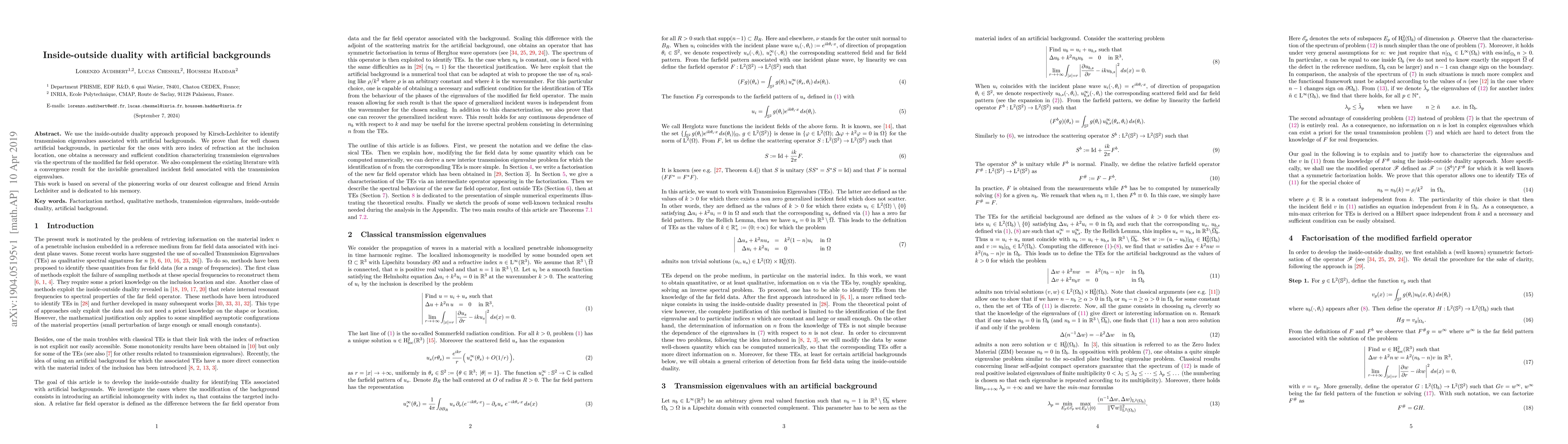 We use the inside-outside duality approach proposed by Kirsch-Lechleiter to identify transmission eigenvalues associated with artificial backgrounds. We prove that for well chosen artificial backgrounds, in particular for the ones with zero index of refraction at the inclusion location, one obtains a necessary and sufficient condition characterizing transmission eigenvalues via the spectrum of the modified far field operator. We also complement the existing literature with a convergence result for the invisible generalized incident field associated with the transmission eigenvalues. This work is based on several of the pioneering works of our dearest colleague and friend Armin Lechleiter and is dedicated to his memory.