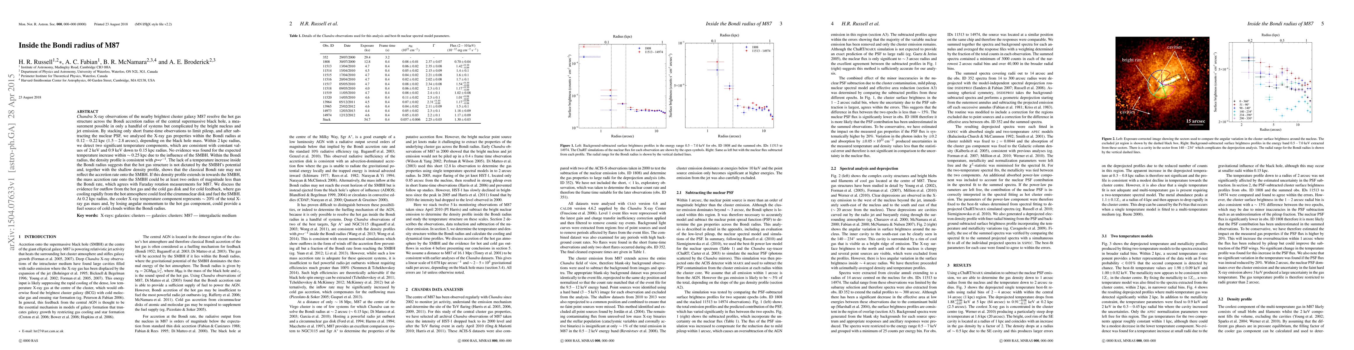 Chandra X-ray observations of the nearby brightest cluster galaxy M87 resolve the hot gas structure across the Bondi accretion radius of the central supermassive black hole, a measurement possible in only a handful of systems but complicated by the bright nucleus and jet emission. By stacking only short frame-time observations to limit pileup, and after subtracting the nuclear PSF, we analysed the X-ray gas properties within the Bondi radius at 0.12-0.22 kpc (1.5-2.8 arcsec), depending on the black hole mass. Within 2 kpc radius, we detect two significant temperature components, which are consistent with constant values of 2 keV and 0.9 keV down to 0.15 kpc radius. No evidence was found for the expected temperature increase within ~0.25 kpc due to the influence of the SMBH. Within the Bondi radius, the density profile is consistent with $\rho\propto r^{-1}$. The lack of a temperature increase inside the Bondi radius suggests that the hot gas structure is not dictated by the SMBH's potential and, together with the shallow density profile, shows that the classical Bondi rate may not reflect the accretion rate onto the SMBH. If this density profile extends in towards the SMBH, the mass accretion rate onto the SMBH could be at least two orders of magnitude less than the Bondi rate, which agrees with Faraday rotation measurements for M87. We discuss the evidence for outflow from the hot gas and the cold gas disk and for cold feedback, where gas cooling rapidly from the hot atmosphere could feed the cirumnuclear disk and fuel the SMBH. At 0.2 kpc radius, the cooler X-ray temperature component represents ~20% of the total X-ray gas mass and, by losing angular momentum to the hot gas component, could provide a fuel source of cold clouds within the Bondi radius.