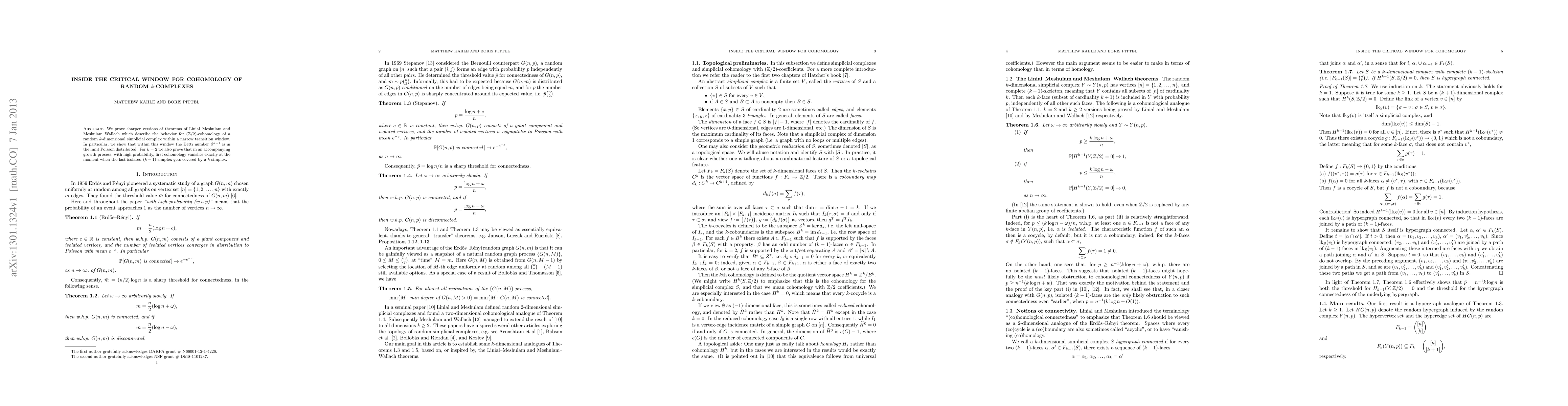 We prove sharper versions of theorems of Linial-Meshulam and Meshulam-Wallach which describe the behavior for (Z/2)-cohomology of a random k-dimensional simplicial complex within a narrow transition window. In particular, we show that within this window the (k-1)st Betti number is in the limit Poisson distributed. For k=2 we also prove that in an accompanying growth process, with high probability, first cohomology vanishes exactly at the moment when the last isolated (k-1)-simplex gets covered by a k-simplex.