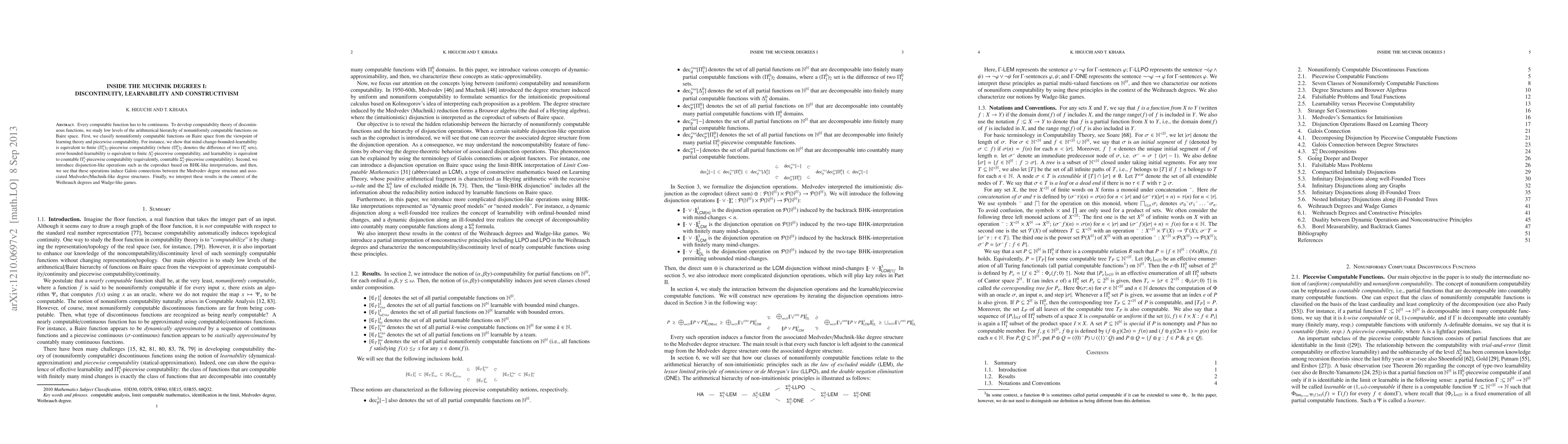 Every computable function has to be continuous. To develop computability theory of discontinuous functions, we study low levels of the arithmetical hierarchy of nonuniformly computable functions on Baire space. First, we classify nonuniformly computable functions on Baire space from the viewpoint of learning theory and piecewise computability. For instance, we show that mind-change-bounded-learnability is equivalent to finite $(\Pi^0_1)_2$-piecewise computability (where $(\Pi^0_1)_2$ denotes the difference of two $\Pi^0_1$ sets), error-bounded-learnability is equivalent to finite $\Delta^0_2$-piecewise computability, and learnability is equivalent to countable $\Pi^0_1$-piecewise computability (equivalently, countable $\Sigma^0_2$-piecewise computability). Second, we introduce disjunction-like operations such as the coproduct based on BHK-like interpretations, and then, we see that these operations induce Galois connections between the Medvedev degree structure and associated Medvedev/Muchnik-like degree structures. Finally, we interpret these results in the context of the Weihrauch degrees and Wadge-like games.