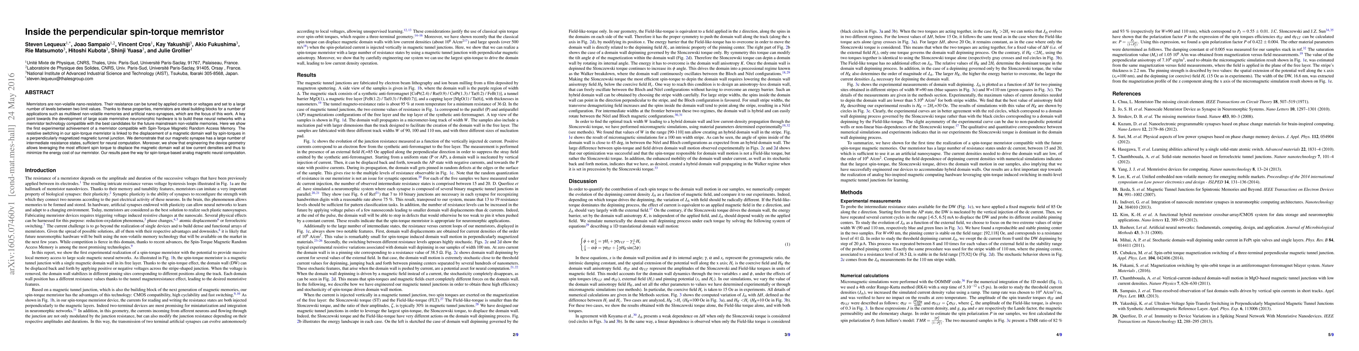 This paper presents a novel spin-torque memristor that operates within a Spin-Torque Magnetic Random Access Memory framework, utilizing magnetic domain wall displacement in a perpendicularly magnetized magnetic tunnel junction. The device demonstrates multiple intermediate resistance states suitable for neural computation and energy-efficient operation through optimized geometry.
