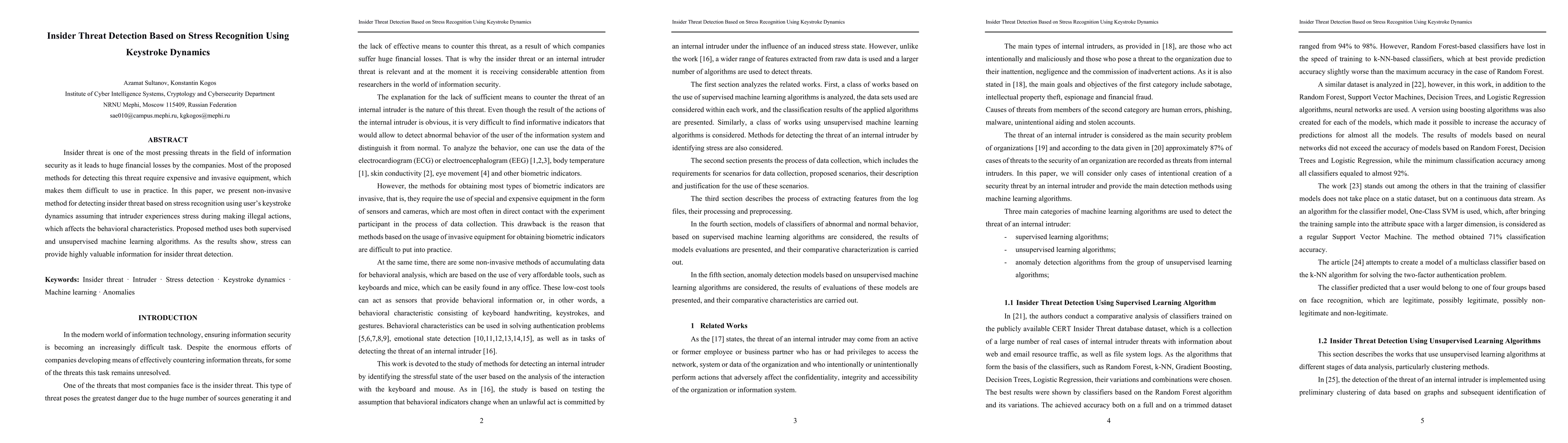 Insider threat is one of the most pressing threats in the field of information security as it leads to huge financial losses by the companies. Most of the proposed methods for detecting this threat require expensive and invasive equipment, which makes them difficult to use in practice. In this paper, we present a non-invasive method for detecting insider threat based on stress recognition using keystroke dynamics assuming that intruder experiences stress during making illegal actions, which affects the behavioral characteristics. Proposed method uses both supervised and unsupervised machine learning algorithms. As the results show, stress can provide highly valuable information for insider threat detection.