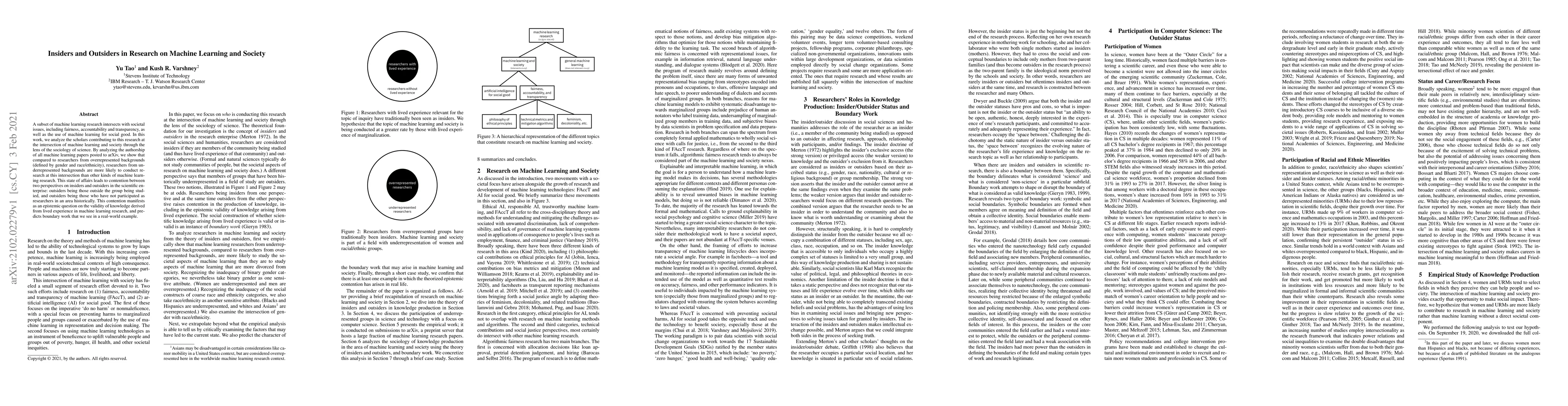 A subset of machine learning research intersects with societal issues, including fairness, accountability and transparency, as well as the use of machine learning for social good. In this work, we analyze the scholars contributing to this research at the intersection of machine learning and society through the lens of the sociology of science. By analyzing the authorship of all machine learning papers posted to arXiv, we show that compared to researchers from overrepresented backgrounds (defined by gender and race/ethnicity), researchers from underrepresented backgrounds are more likely to conduct research at this intersection than other kinds of machine learning research. This state of affairs leads to contention between two perspectives on insiders and outsiders in the scientific enterprise: outsiders being those outside the group being studied, and outsiders being those who have not participated as researchers in an area historically. This contention manifests as an epistemic question on the validity of knowledge derived from lived experience in machine learning research, and predicts boundary work that we see in a real-world example.
