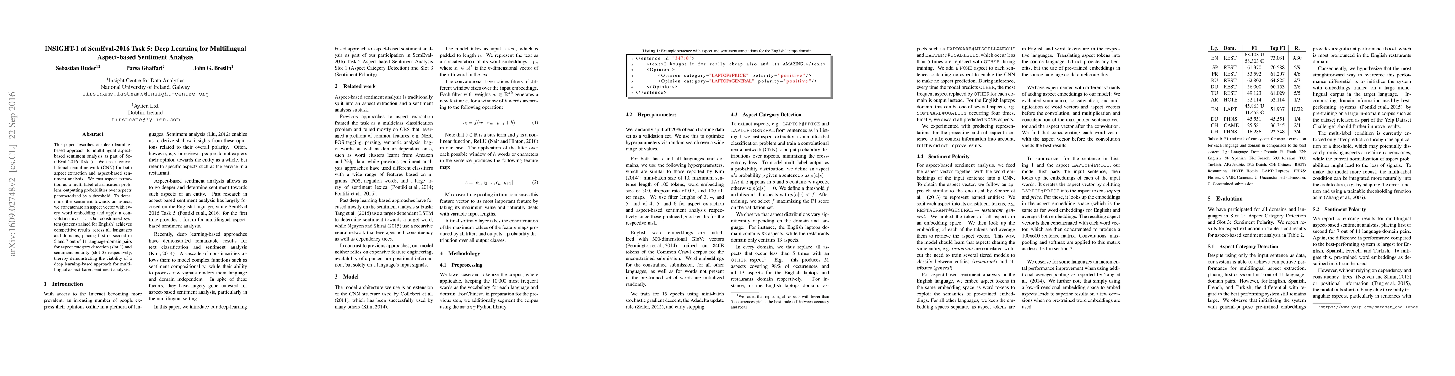 This paper describes our deep learning-based approach to multilingual aspect-based sentiment analysis as part of SemEval 2016 Task 5. We use a convolutional neural network (CNN) for both aspect extraction and aspect-based sentiment analysis. We cast aspect extraction as a multi-label classification problem, outputting probabilities over aspects parameterized by a threshold. To determine the sentiment towards an aspect, we concatenate an aspect vector with every word embedding and apply a convolution over it. Our constrained system (unconstrained for English) achieves competitive results across all languages and domains, placing first or second in 5 and 7 out of 11 language-domain pairs for aspect category detection (slot 1) and sentiment polarity (slot 3) respectively, thereby demonstrating the viability of a deep learning-based approach for multilingual aspect-based sentiment analysis.