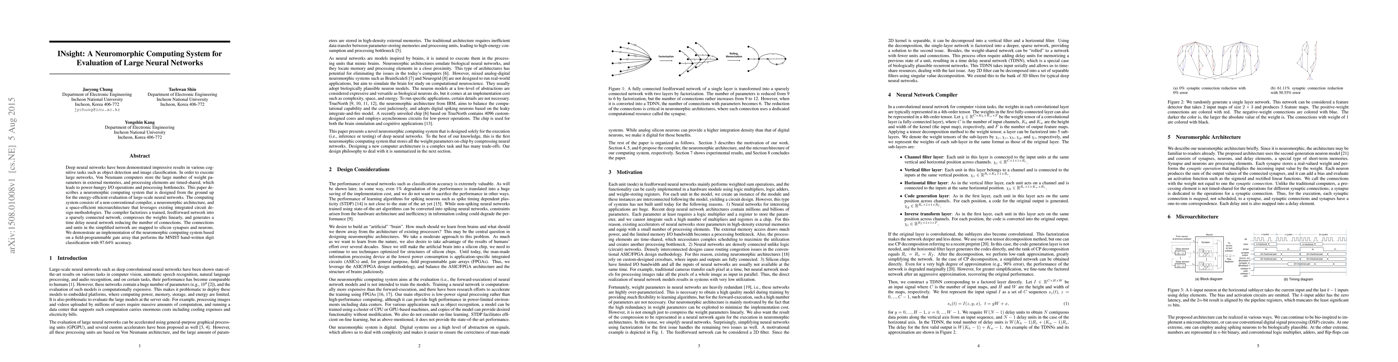 This paper introduces INsight, a neuromorphic computing system designed for energy-efficient evaluation of large neural networks, featuring a specialized compiler, neuromorphic architecture, and microarchitecture to reduce I/O operations and processing bottlenecks. The system achieves 97.64% accuracy in MNIST classification using a FPGA-based implementation.