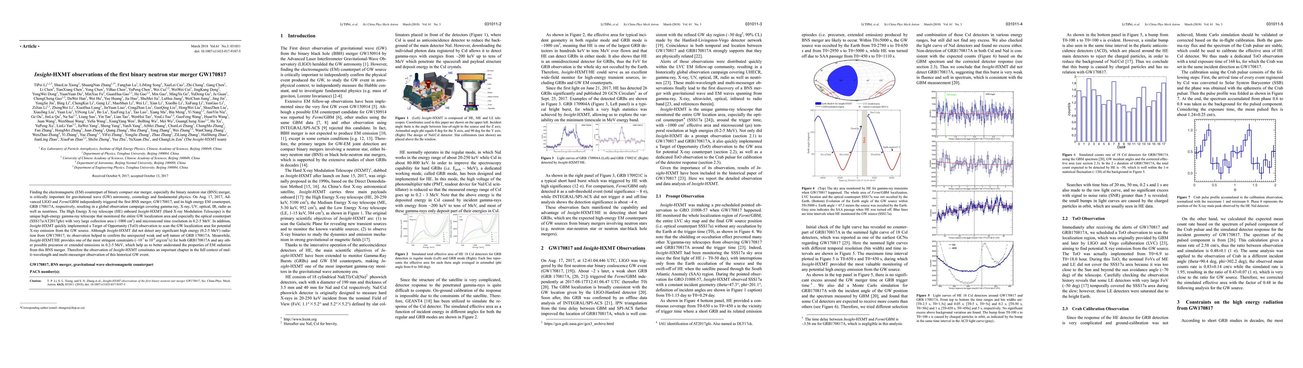 The Insight-HXMT telescope observed the first binary neutron star merger, GW170817, but did not detect significant high-energy radiation. It confirmed the weak and soft nature of the associated GRB 170817A and provided stringent constraints on possible precursor or extended emissions.