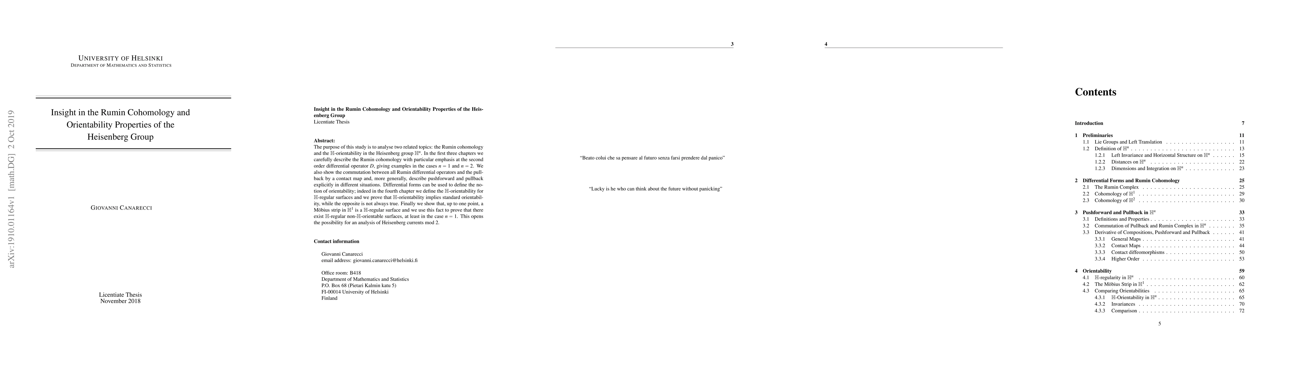 This paper explores Rumin cohomology and $\mathbb{H}$-orientability in the Heisenberg group $\mathbb{H}^n$. It details the Rumin differential operator and its properties, and demonstrates $\mathbb{H}$-orientability's implications for standard orientability, revealing the existence of $\mathbb{H}$-regular non-$\mathbb{H}$-orientable surfaces in $\mathbb{H}^1$.