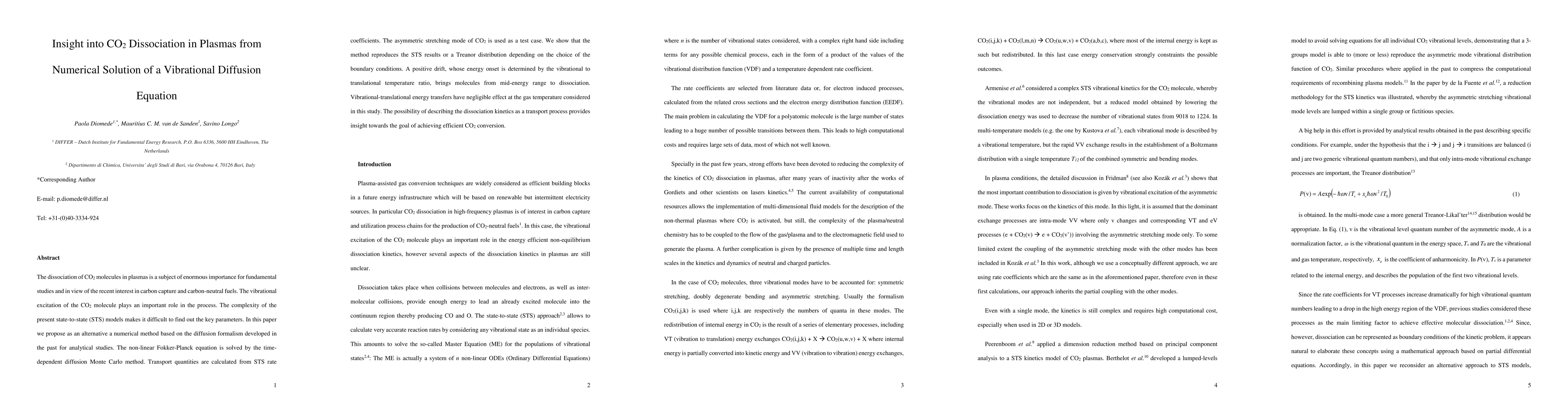 The dissociation of CO2 molecules in plasmas is a subject of enormous importance for fundamental studies and the recent interest in carbon capture and carbon-neutral fuels. The vibrational excitation of the CO2 molecule plays an important role in the process. The complexity of the present state-to-state (STS) models makes it difficult to find out the key parameters. In this paper we propose as an alternative a numerical method based on the diffusion formalism developed in the past for analytical studies. The non-linear Fokker-Planck equation is solved by the time-dependent diffusion Monte Carlo method. Transport quantities are calculated from STS rate coefficients. The asymmetric stretching mode of CO2 is used as a test case. We show that the method reproduces the STS results or a Treanor distribution depending on the choice of the boundary conditions. A positive drift, whose energy onset is determined by the vibrational to translational temperature ratio, brings molecules from mid-energy range to dissociation. The high-energy fall of the distribution is observed even neglecting VT processes which are normally believed to be its cause. Our study explains several puzzling features of previous studies, provides new insights into the control of the dissociation rate and a much sought compression of the required data for modeling.