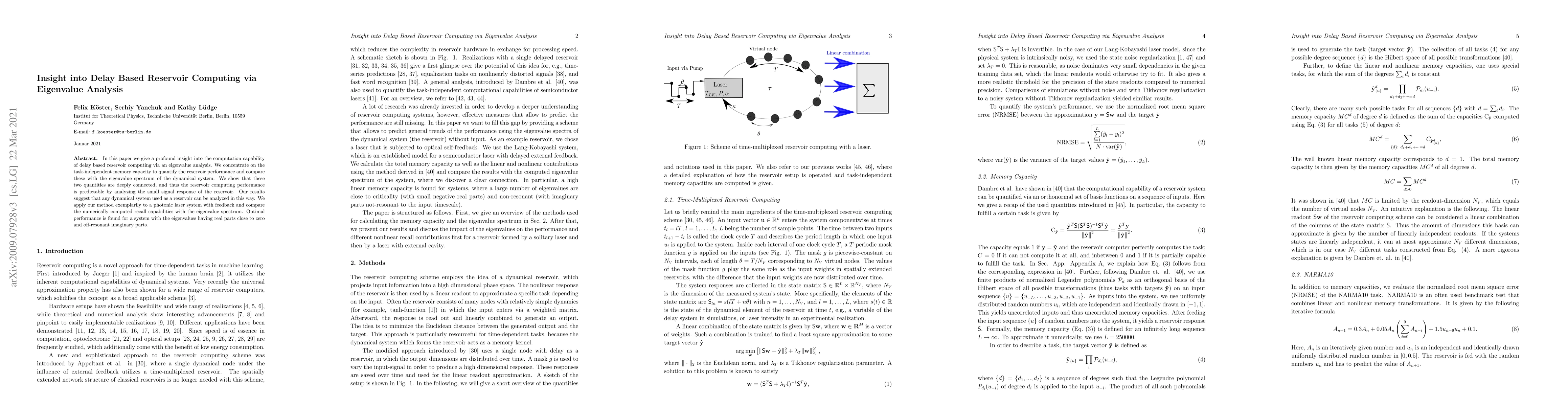 This paper explores the computational capabilities of delay-based reservoir computing through eigenvalue analysis, demonstrating a strong connection between task-independent memory capacity and the dynamical system's eigenvalue spectrum. The study applies the method to a photonic laser system, finding optimal performance when eigenvalues have real parts near zero and off-resonant imaginary parts.