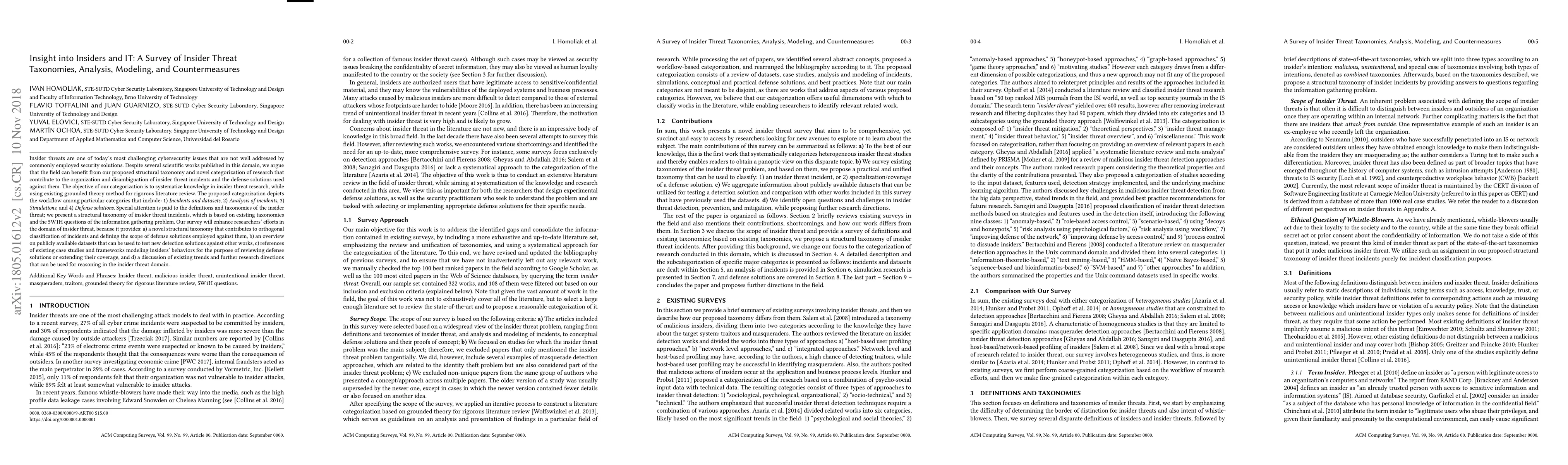 Insider threats are one of today's most challenging cybersecurity issues that are not well addressed by commonly employed security solutions. Despite several scientific works published in this domain, we argue that the field can benefit from the proposed structural taxonomy and novel categorization of research that contribute to the organization and disambiguation of insider threat incidents and the defense solutions used against them. The objective of our categorization is to systematize knowledge in insider threat research, while leveraging existing grounded theory method for rigorous literature review. The proposed categorization depicts the workflow among particular categories that include: 1) Incidents and datasets, 2) Analysis of attackers, 3) Simulations, and 4) Defense solutions. Special attention is paid to the definitions and taxonomies of the insider threat; we present a structural taxonomy of insider threat incidents, which is based on existing taxonomies and the 5W1H questions of the information gathering problem. Our survey will enhance researchers' efforts in the domain of insider threat, because it provides: a) a novel structural taxonomy that contributes to orthogonal classification of incidents and defining the scope of defense solutions employed against them, b) an updated overview on publicly available datasets that can be used to test new detection solutions against other works, c) references of existing case studies and frameworks modeling insiders' behaviors for the purpose of reviewing defense solutions or extending their coverage, and d) a discussion of existing trends and further research directions that can be used for reasoning in the insider threat domain.