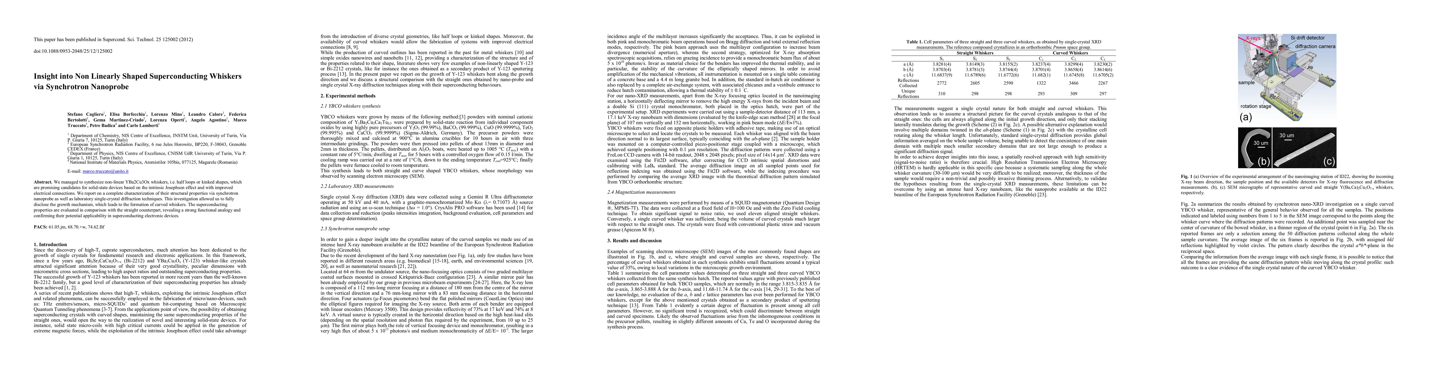 We managed to synthesize non-linear YBa2Cu3Ox whiskers, i.e. half loops or kinked shapes, which are promising candidates for solid-state devices based on the intrinsic Josephson effect and with improved electrical connections. We report on a complete characterization of their structural properties via synchrotron nanoprobe as well as laboratory single-crystal diffraction techniques. This investigation allowed us to fully disclose the growth mechanism, which leads to the formation of curved whiskers. The superconducting properties are evaluated in comparison with the straight counterpart, revealing a strong functional analogy and confirming their potential applicability in superconducting electronic devices.