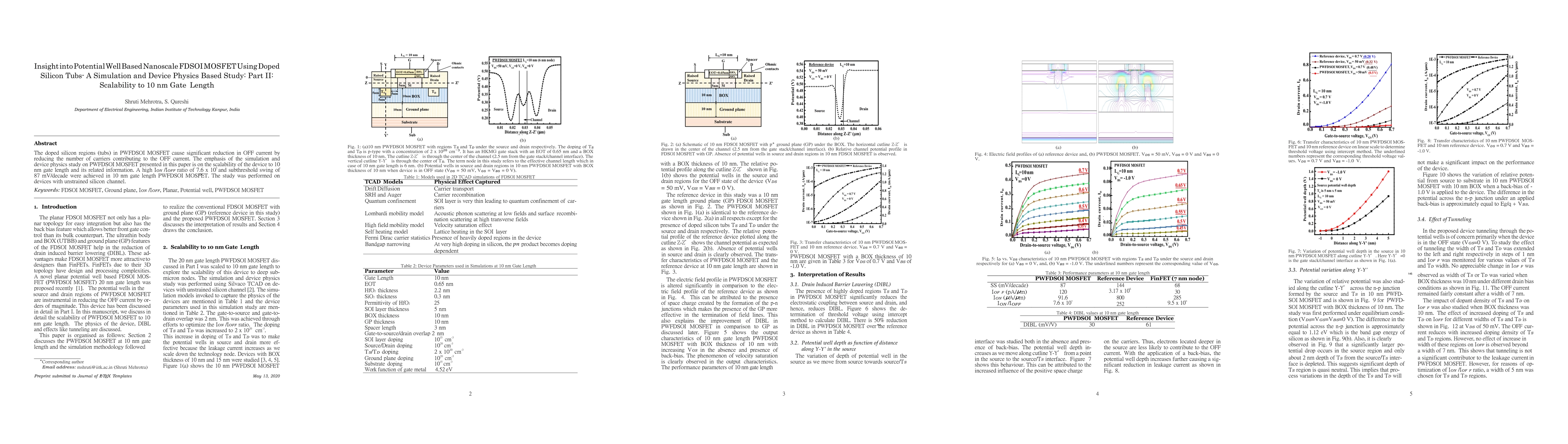This study investigates the scalability of potential well-based fully depleted silicon-on-insulator (PWFDSOI) MOSFETs to 10 nm gate length, focusing on doped silicon tubs that reduce OFF current. The research achieved a high ION/IOFF ratio of 7.6 x 10^5 and a subthreshold swing of 87 mV/decade in unstrained silicon channel devices.