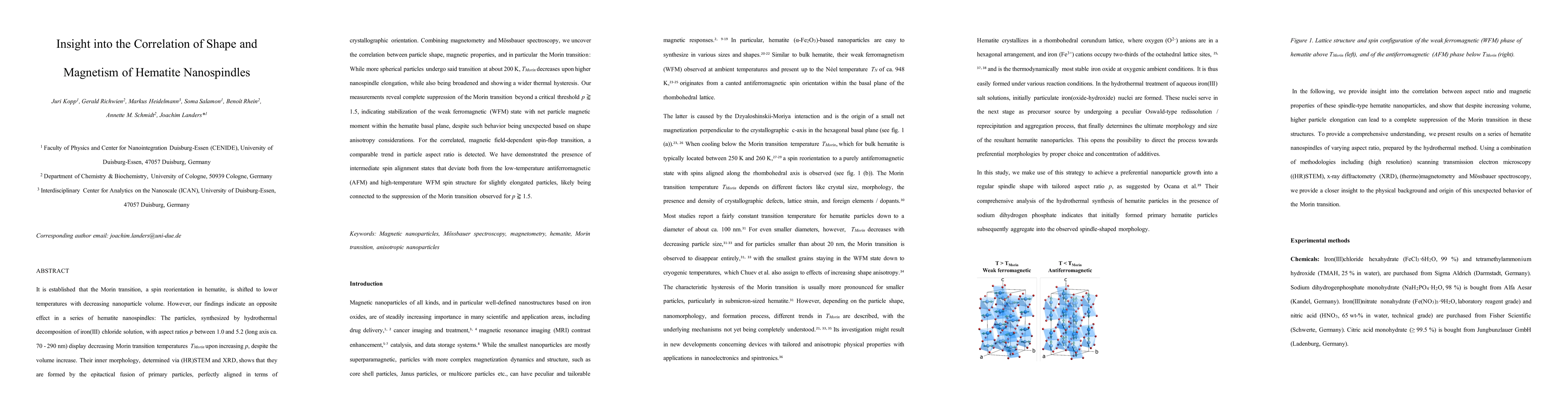 Hematite nanospindles were synthesized via hydrothermal decomposition of iron(III) chloride solution, characterized by (HR)STEM, XRD, magnetometry, and Mössbauer spectroscopy to study shape-magnetism correlation.