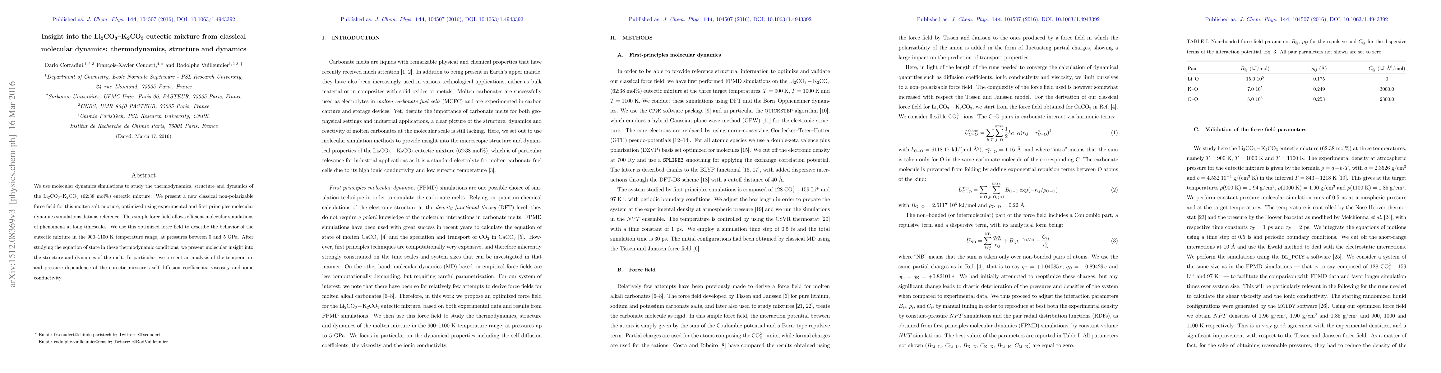 In this work, we use molecular dynamics simulations to study the thermodynamics, structure and dynamics of the Li$_2$CO$_3$-K$_2$CO$_3$ (62:38 mol%) eutectic mixture. We present a new classical non-polarizable force field for this molten salt mixture, optimized using experimental and first principles molecular dynamics simulations as reference data. This simple force field allows efficient molecular simulations of phenomena at long timescales. We use this optimized force field to describe the behavior of the eutectic mixture in the 900-1100 K temperature range, at pressures between 0 and 5 GPa. After studying the equation of state in these thermodynamic conditions, we present molecular insight into the structure and dynamics of the melt. In particular, we present an analysis of the temperature and pressure dependence of the eutectic mixture's self diffusion coefficients, viscosity and ionic conductivity.