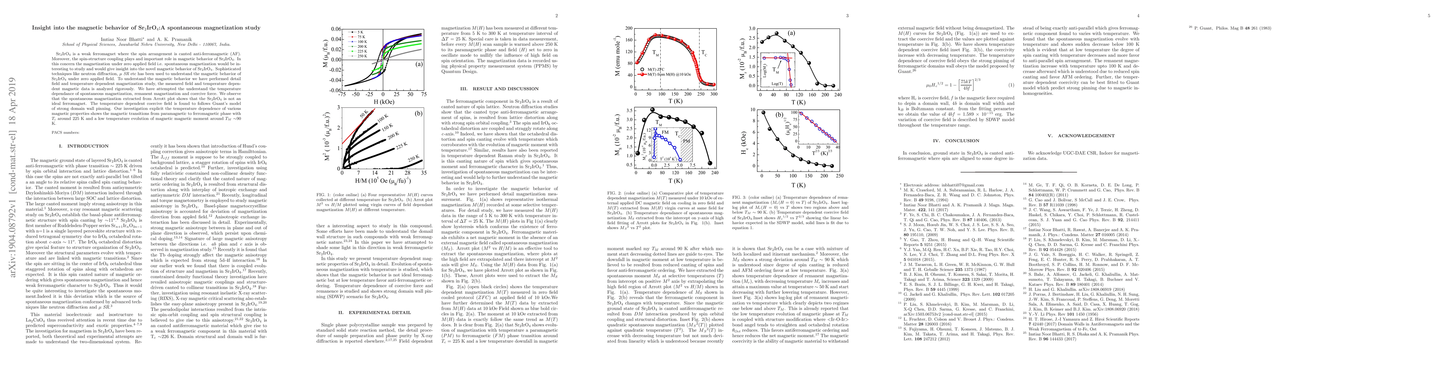 Sr$_2$IrO$_4$ exhibits canted anti-ferromagnetic spin arrangement and weak ferromagnetic behavior with spontaneous magnetization, studied through detailed field and temperature dependent magnetization measurements. The temperature dependence reveals magnetic transitions and a critical temperature $T_c$ of 225 K, indicating a deviation from ideal ferromagnetic behavior.