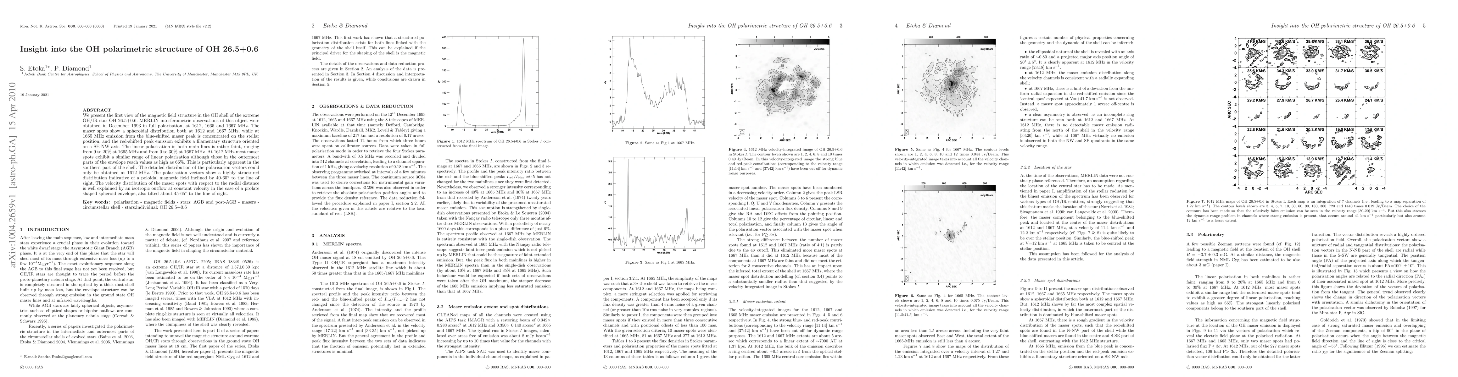 We present the first view of the magnetic field structure in the OH shell of the extreme OH/IR star OH 26.5+0.6. MERLIN interferometric observations of this object were obtained in December 1993 in full polarisation, at 1612, 1665 and 1667 MHz. The maser spots show a spheroidal distribution both at 1612 and 1667 MHz, while at 1665 MHz emission from the blue-shifted maser peak is concentrated on the stellar position, and the red-shifted peak emission exhibits a filamentary structure oriented on a SE-NW axis. The linear polarisation in both main lines is rather faint, ranging from 9 to 20% at 1665 MHz and from 0 to 30% at 1667 MHz. At 1612 MHz most maser spots exhibit a similar range of linear polarisation although those in the outermost parts of the envelope reach values as high as 66%. This is particularly apparent in the southern part of the shell. The detailed distribution of the polarisation vectors could only be obtained at 1612 MHz. The polarisation vectors show a highly structured distribution indicative of a poloidal magnetic field inclined by 40-60$^\circ$ to the line of sight. The velocity distribution of the maser spots with respect to the radial distance is well explained by an isotropic outflow at constant velocity in the case of a prolate shaped spheroid envelope, also tilted about 45-65$^\circ$ to the line of sight.