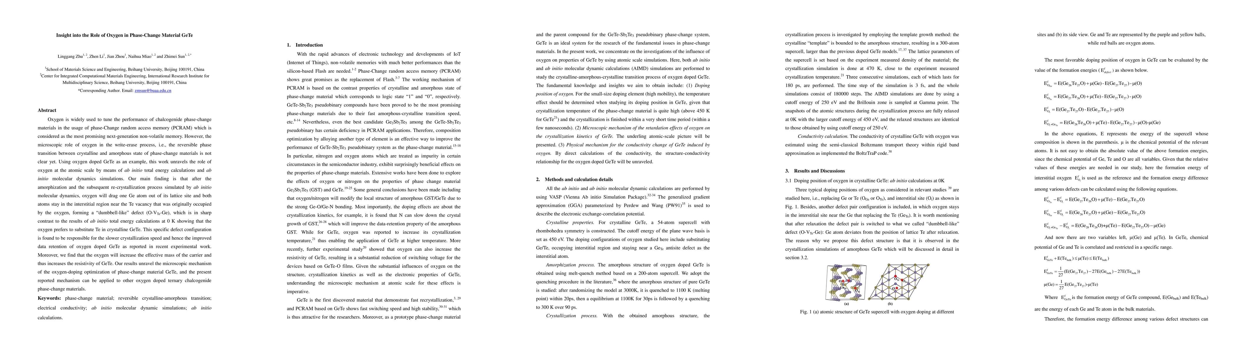 This study reveals that oxygen doping in GeTe phase-change material creates a "dumbbell-like" defect (O-VTe-Ge) during the reversible phase transition, which slows crystallization and enhances data retention. Additionally, oxygen increases carrier effective mass and resistivity in GeTe.
