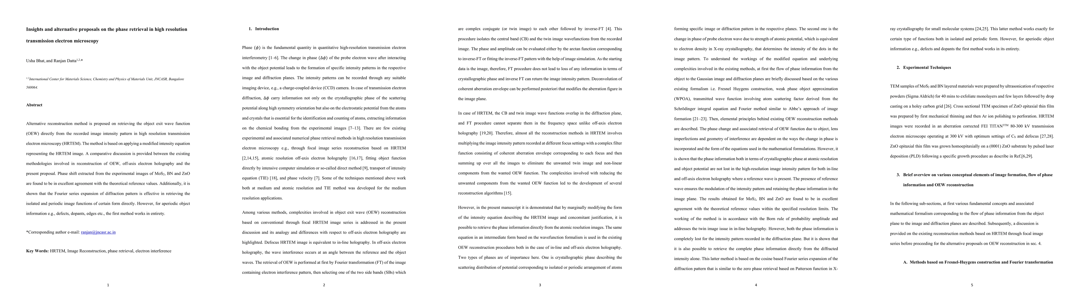 Alternative reconstruction method is proposed on retrieving the object exit wave function (OEW) directly from the recorded image intensity pattern in high resolution transmission electron microscopy (HRTEM). The method is based on applying a modified intensity equation representing the HRTEM image. A comparative discussion is provided between the existing methodologies involved in reconstruction of OEW, off-axis electron holography and the present proposal. Phase shift extracted from the experimental images of MoS2, BN and ZnO are found to be in excellent agreement with the theoretical reference values. Additionally, it is shown that the Fourier series expansion of diffraction pattern is effective in retrieving the isolated and periodic image functions of certain form directly. However, for aperiodic object information e.g., defects, dopants, edges etc., the first method works in entirety.