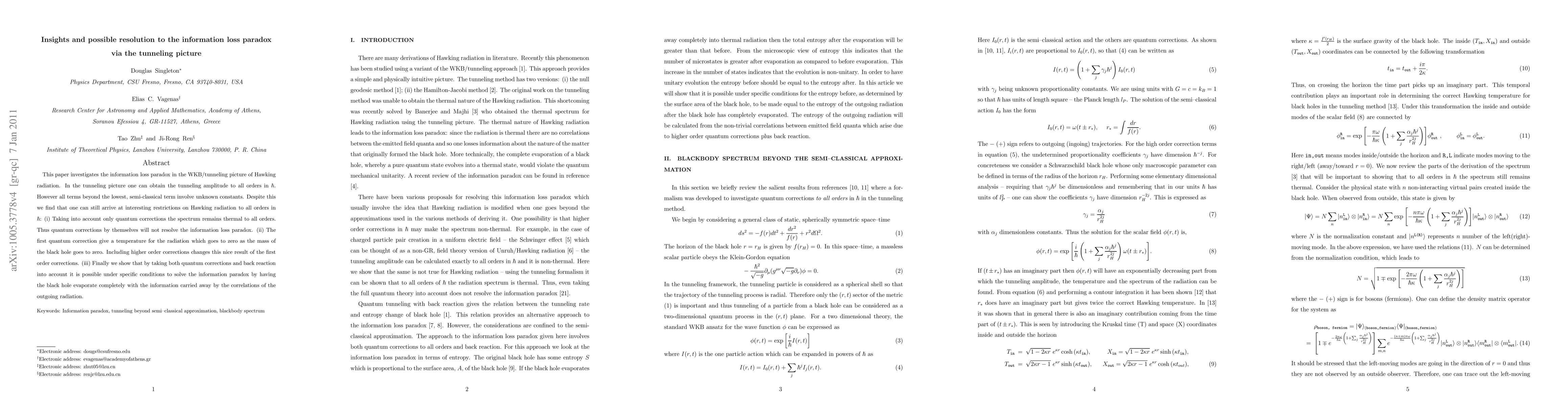 This paper investigates the information loss paradox in the WKB/tunneling picture of Hawking radiation. In the tunneling picture one can obtain the tunneling amplitude to all orders in $\hbar$. However all terms beyond the lowest, semi-classical term involve unknown constants. Despite this we find that one can still arrive at interesting restrictions on Hawking radiation to all orders in $\hbar$: (i) Taking into account only quantum corrections the spectrum remains thermal to all orders. Thus quantum corrections by themselves will not resolve the information loss paradox. (ii) The first quantum correction give a temperature for the radiation which goes to zero as the mass of the black hole goes to zero. Including higher order corrections changes this nice result of the first order corrections. (iii) Finally we show that by taking both quantum corrections and back reaction into account it is possible under specific conditions to solve the information paradox by having the black hole evaporate completely with the information carried away by the correlations of the outgoing radiation.