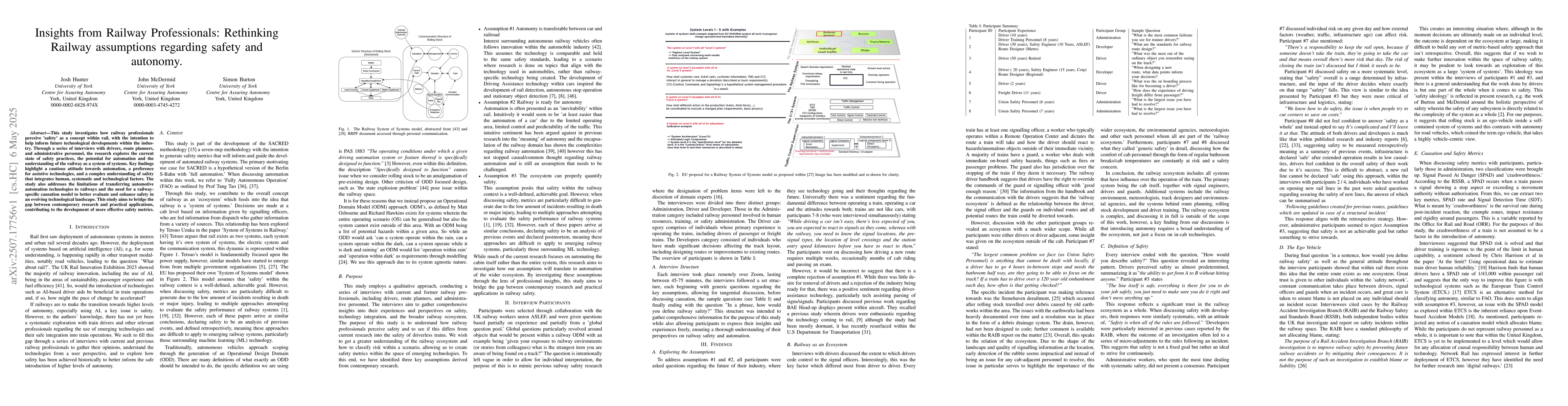 This study investigates how railway professionals perceive safety as a concept within rail, with the intention to help inform future technological developments within the industry. Through a series of interviews with drivers, route planners,and administrative personnel, the research explores the currentstate of safety practices, the potential for automation and the understanding of the railway as a system of systems. Key findings highlight a cautious attitude towards automation, a preference for assistive technologies, and a complex understanding of safety that integrates human, systematic and technological factors. The study also addresses the limitations of transferring automotive automation technologies to railways and the need for a railway-specific causation model to better evaluate and enhance safety in an evolving technological landscape. This study aims to bridge thegap between contemporary research and practical applications, contributing to the development of more effective safety metrics.