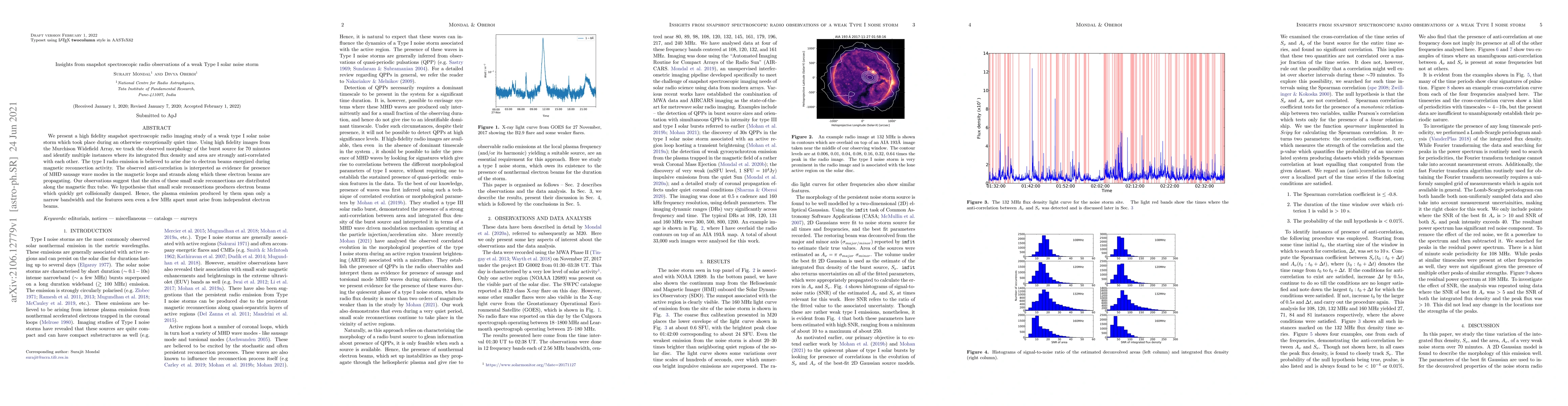This study uses high-resolution radio imaging to analyze a weak type I solar noise storm, revealing an anti-correlation between flux density and area, suggesting the presence of MHD sausage wave modes in magnetic loops. The findings indicate that small-scale reconnections produce narrowly-banded electron beams.