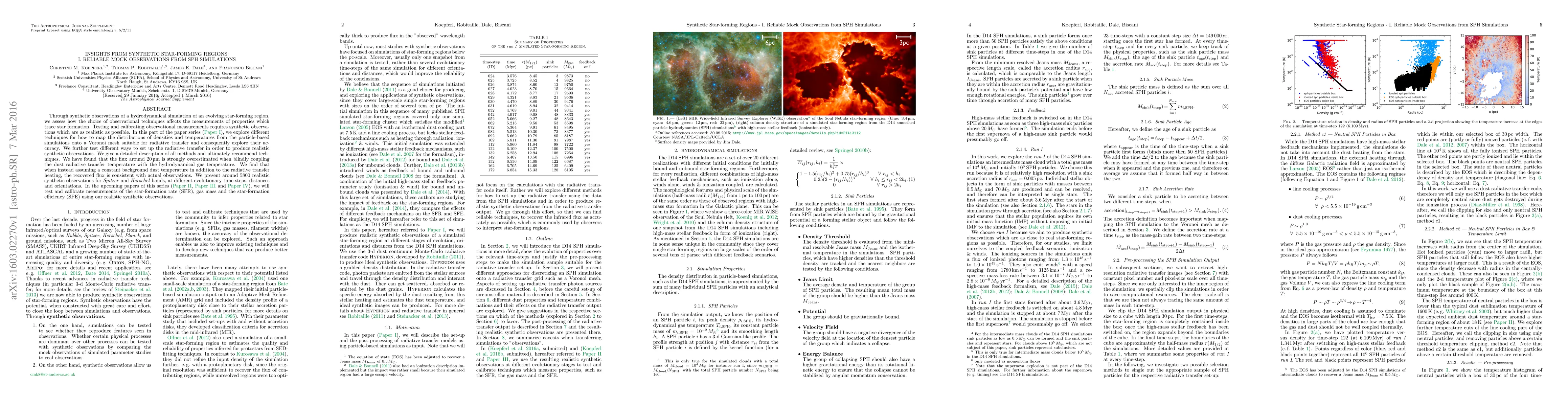 Through synthetic observations of a hydrodynamical simulation of an evolving star-forming region, we assess how the choice of observational techniques affects the measurements of properties which trace star formation. Testing and calibrating observational measurements requires synthetic observations which are as realistic as possible. In this part of the paper series (Paper I), we explore different techniques for how to map the distributions of densities and temperatures from the particle-based simulations onto a Voronoi mesh suitable for radiative transfer and consequently explore their accuracy. We further test different ways to set up the radiative transfer in order to produce realistic synthetic observations. We give a detailed description of all methods and ultimately recommend techniques. We have found that the flux around 20 microns is strongly overestimated when blindly coupling the dust radiative transfer temperature with the hydrodynamical gas temperature. We find that when instead assuming a constant background dust temperature in addition to the radiative transfer heating, the recovered flux is consistent with actual observations. We present around 5800 realistic synthetic observations for Spitzer and Herschel bands, at different evolutionary time-steps, distances and orientations. In the upcoming papers of this series (Paper II, Paper III and Paper IV), we will test and calibrate measurements of the star-formation rate (SFR), gas mass and the star-formation efficiency (SFE) using our realistic synthetic observations.