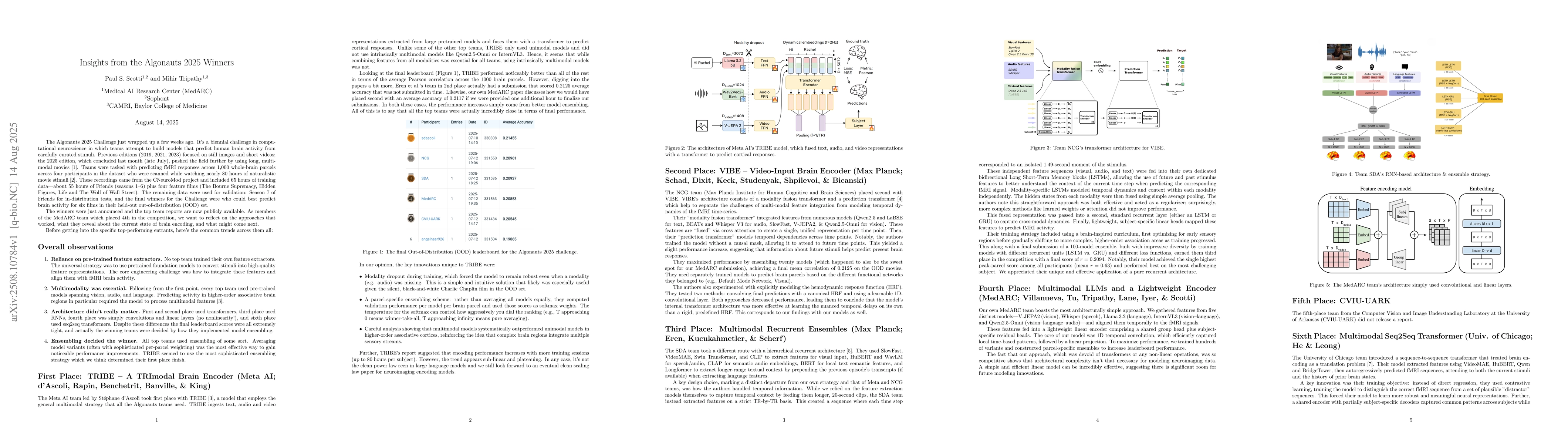 The Algonauts 2025 Challenge just wrapped up a few weeks ago. It is a biennial challenge in computational neuroscience in which teams attempt to build models that predict human brain activity from carefully curated stimuli. Previous editions (2019, 2021, 2023) focused on still images and short videos; the 2025 edition, which concluded last month (late July), pushed the field further by using long, multimodal movies. Teams were tasked with predicting fMRI responses across 1,000 whole-brain parcels across four participants in the dataset who were scanned while watching nearly 80 hours of naturalistic movie stimuli. These recordings came from the CNeuroMod project and included 65 hours of training data, about 55 hours of Friends (seasons 1-6) plus four feature films (The Bourne Supremacy, Hidden Figures, Life, and The Wolf of Wall Street). The remaining data were used for validation: Season 7 of Friends for in-distribution tests, and the final winners for the Challenge were those who could best predict brain activity for six films in their held-out out-of-distribution (OOD) set. The winners were just announced and the top team reports are now publicly available. As members of the MedARC team which placed 4th in the competition, we reflect on the approaches that worked, what they reveal about the current state of brain encoding, and what might come next.