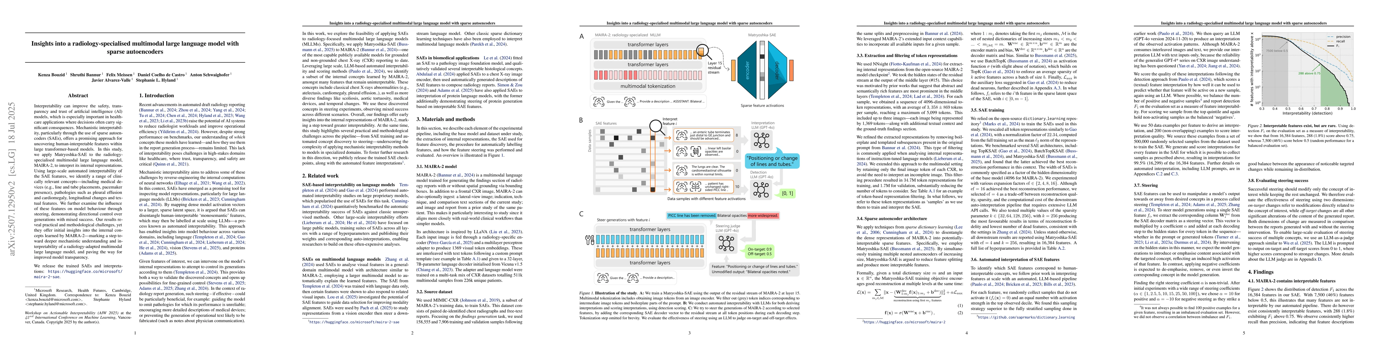Interpretability can improve the safety, transparency and trust of AI models, which is especially important in healthcare applications where decisions often carry significant consequences. Mechanistic interpretability, particularly through the use of sparse autoencoders (SAEs), offers a promising approach for uncovering human-interpretable features within large transformer-based models. In this study, we apply Matryoshka-SAE to the radiology-specialised multimodal large language model, MAIRA-2, to interpret its internal representations. Using large-scale automated interpretability of the SAE features, we identify a range of clinically relevant concepts - including medical devices (e.g., line and tube placements, pacemaker presence), pathologies such as pleural effusion and cardiomegaly, longitudinal changes and textual features. We further examine the influence of these features on model behaviour through steering, demonstrating directional control over generations with mixed success. Our results reveal practical and methodological challenges, yet they offer initial insights into the internal concepts learned by MAIRA-2 - marking a step toward deeper mechanistic understanding and interpretability of a radiology-adapted multimodal large language model, and paving the way for improved model transparency. We release the trained SAEs and interpretations: https://huggingface.co/microsoft/maira-2-sae.
