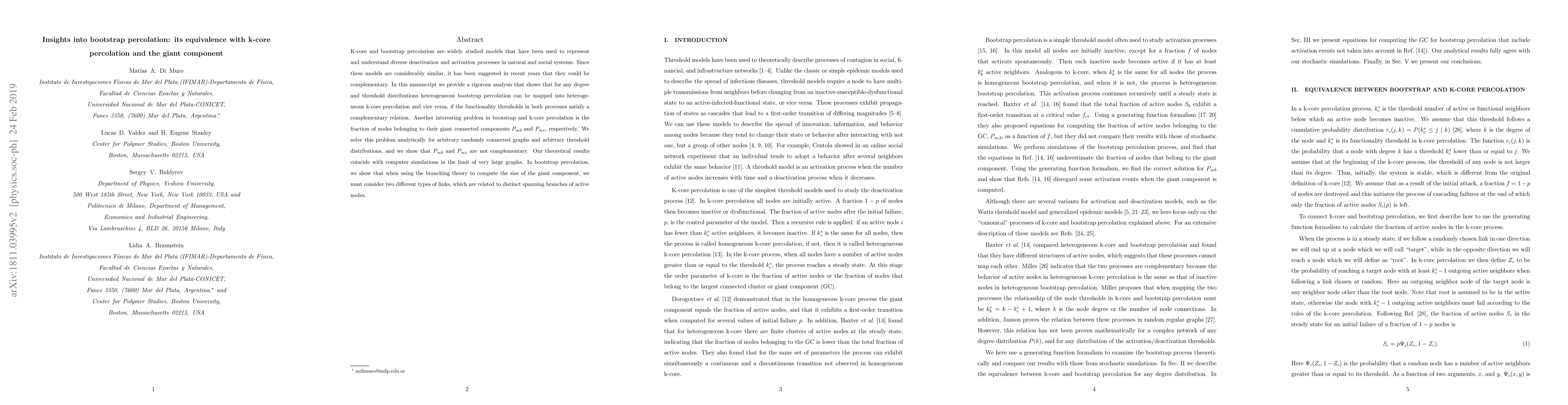 This paper rigorously demonstrates the equivalence between bootstrap percolation and k-core percolation under specific threshold conditions, and analytically solves for the size of their giant connected components, showing they are not complementary. The study also highlights the importance of considering two distinct types of links in bootstrap percolation for accurate giant component size computation.