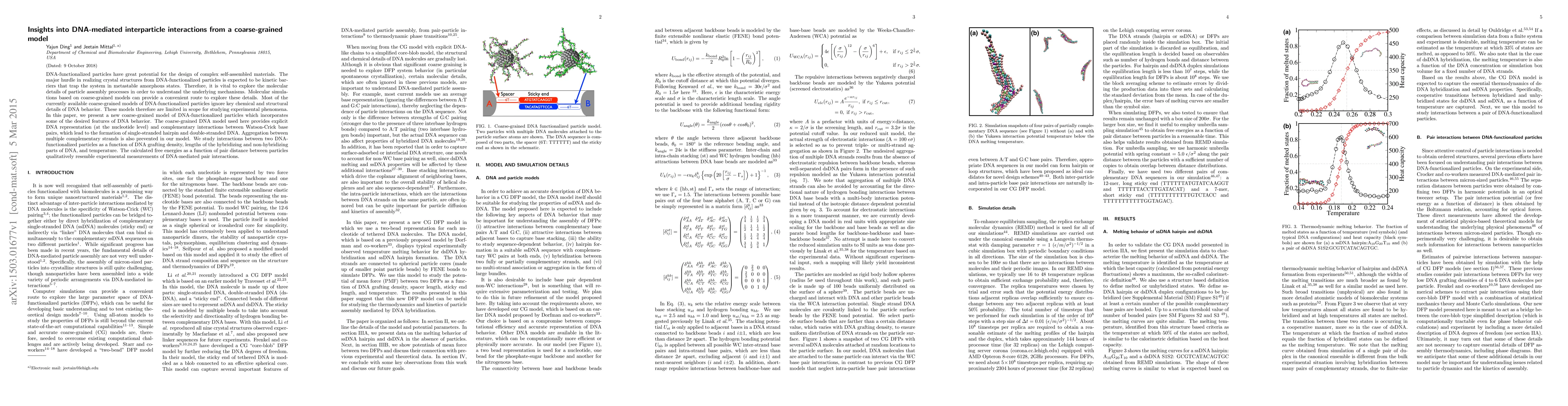 This paper introduces a new coarse-grained model for DNA-functionalized particles that explicitly represents DNA nucleotides and includes complementary base pairing interactions. The model is used to study DNA-mediated interparticle interactions, revealing insights into the effects of DNA grafting density, DNA length, and temperature on particle assembly.