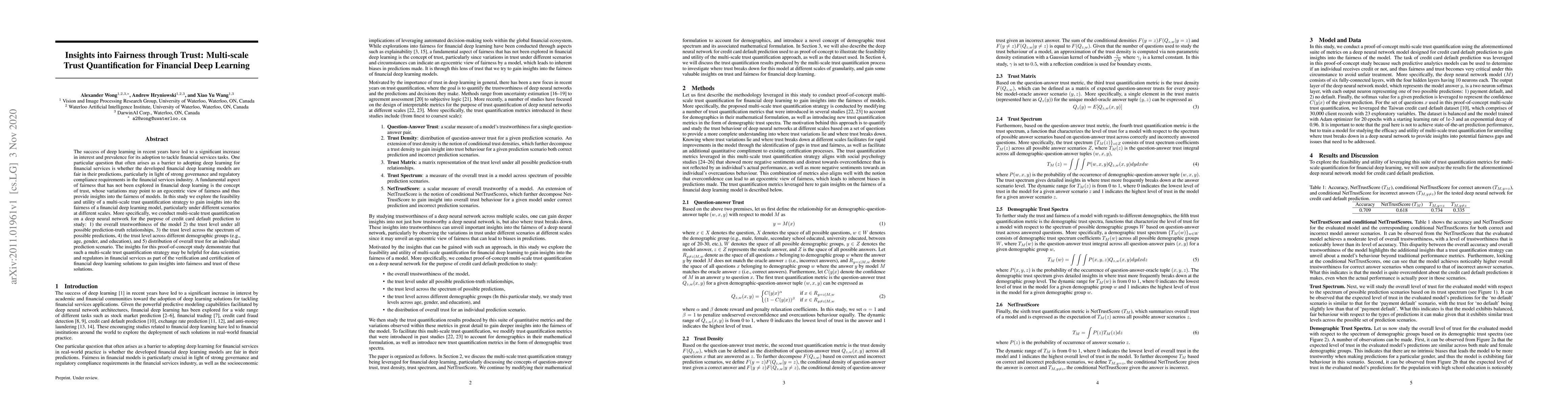 This paper explores a multi-scale trust quantification strategy to assess the fairness of financial deep learning models, particularly for credit card default prediction. The study reveals insights into overall trustworthiness, trust levels across prediction scenarios, and demographic groups, suggesting this approach aids in verifying fairness and trust in financial deep learning solutions.