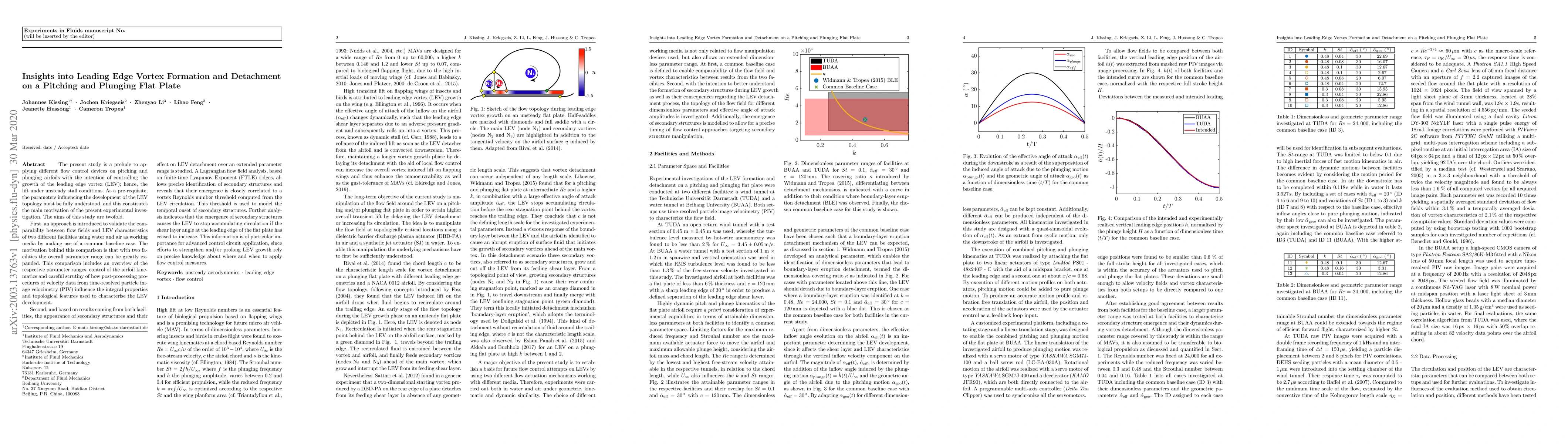 This paper investigates the formation and detachment of leading edge vortices (LEV) on a pitching and plunging flat plate, aiming to understand parameters influencing LEV topology for flow control applications. It compares flow fields from water and air facilities and identifies secondary structures using FTLE ridges, revealing a vortex Reynolds number threshold linked to secondary structure emergence and LEV detachment.