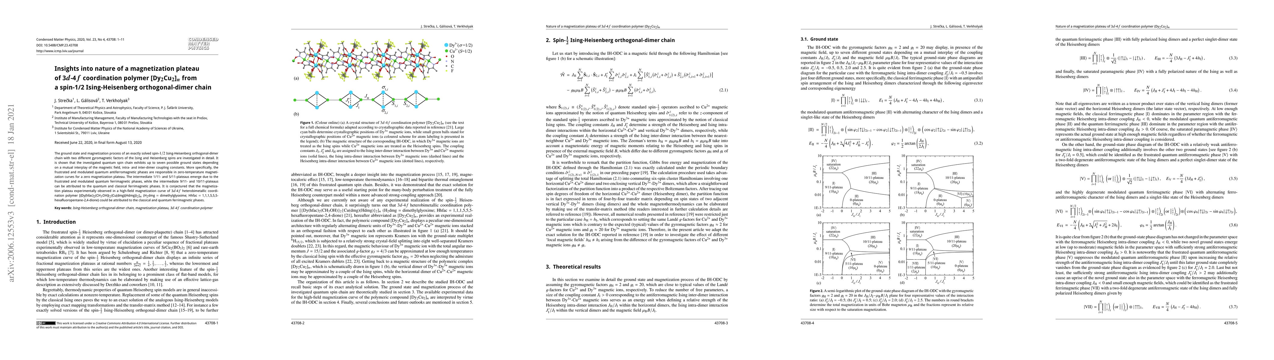 This paper investigates the ground state and magnetization process of a spin-1/2 Ising-Heisenberg orthogonal-dimer chain, revealing up to seven ground states and multiple magnetization plateaus due to various quantum phases. The study suggests that the observed plateaus in a Dy$_2$Cu$_2$ coordination polymer can be linked to classical and quantum ferrimagnetic phases.