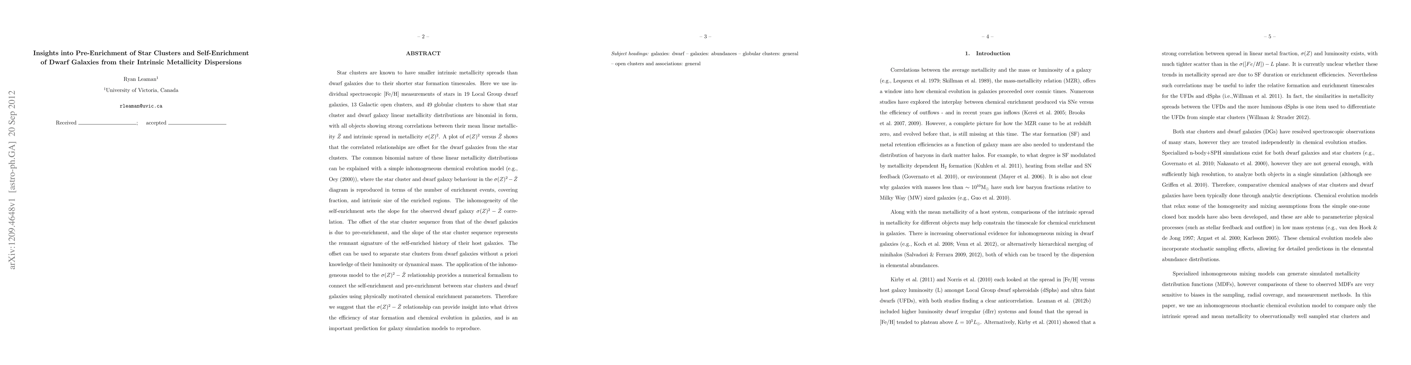 This paper investigates the intrinsic metallicity dispersions in star clusters and dwarf galaxies using spectroscopic data, revealing a binomial form for their metallicity distributions. It finds a correlation between mean metallicity and metallicity spread, with star clusters differing from dwarf galaxies due to pre-enrichment and self-enrichment processes, respectively.