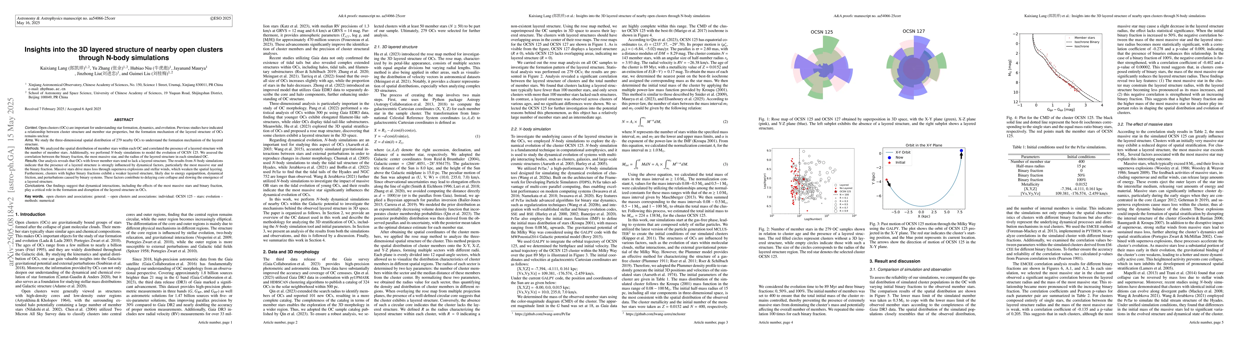 The study applied the rose diagram method to examine the 3D layered structure of 279 open clusters (OCs) and performed N-body simulations to understand the formation mechanism of the layered structure in OCs, focusing on OCSN 125.