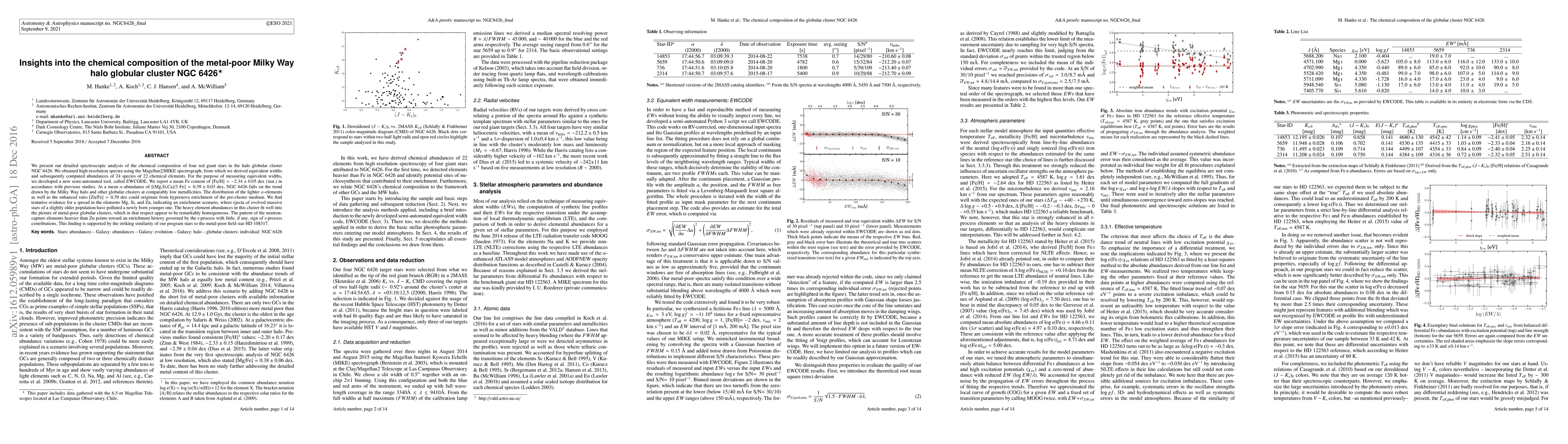 The study analyzes the chemical composition of the metal-poor Milky Way halo globular cluster NGC 6426 using high-resolution spectra of four red giant stars. A new semi-automated tool, EWCODE, was developed for equivalent width measurements. The cluster's mean Fe content is -2.34 dex, and its alpha-abundance aligns with the Milky Way halo trend. The lighter alpha-elements and Zn/Fe ratio suggest hypernova enrichment. Tentative evidence indicates a spread in Mg, Si, and Zn, pointing to an enrichment scenario involving evolved massive stars. The neutron-capture elements suggest r-process enrichment with minimal s-process contributions, similar to the metal-poor field star HD 108317.