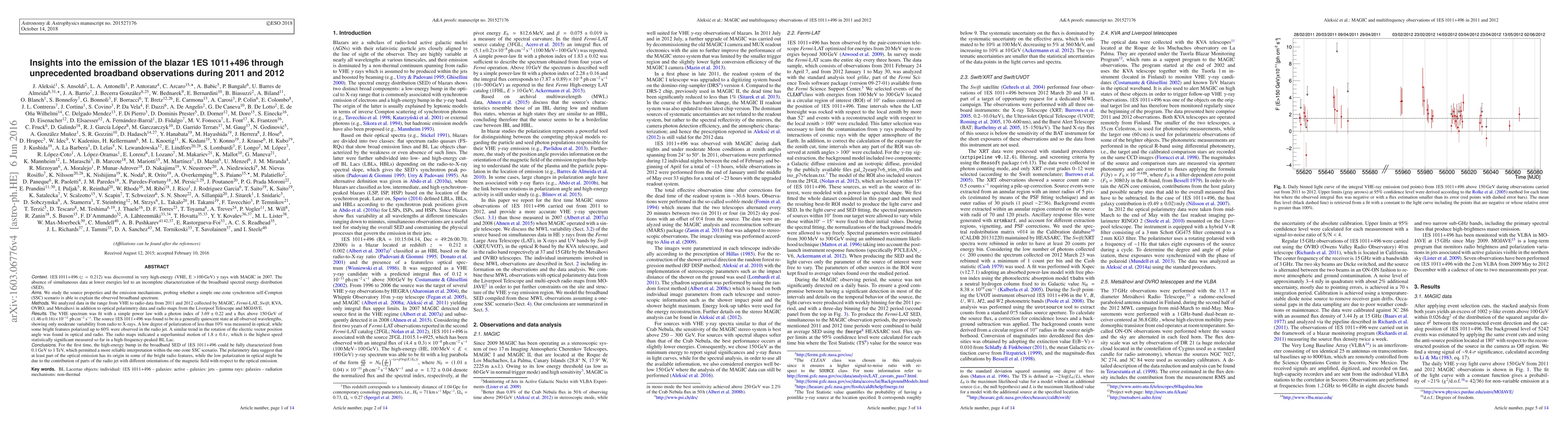1ES 1011+496 $(z=0.212)$ was discovered in very high energy (VHE, E >100 GeV) $\gamma$-rays with MAGIC in 2007. The absence of simultaneous data at lower energies led to a rather incomplete characterization of the broadband spectral energy distribution (SED). We study the source properties and the emission mechanisms, probing whether a simple one-zone synchrotron-self-Compton (SSC) scenario is able to explain the observed broadband spectrum. We analyzed VHE to radio data from 2011 and 2012 collected by MAGIC, $Fermi$-LAT, $Swift$, KVA, OVRO, and Mets\"ahovi in addition to optical polarimetry data and radio maps from the Liverpool Telescope and MOJAVE. The VHE spectrum was fit with a simple power law with a photon index of $3.69\pm0.22$ and a flux above 150 GeV of $(1.46\pm0.16)\times10^{-11}$ ph cm$^{-2}$ s$^{-1}$. 1ES 1011+496 was found to be in a generally quiescent state at all observed wavelengths, showing only moderate variability from radio to X-rays. A low degree of polarization of less than 10% was measured in optical, while some bright features polarized up to 60% were observed in the radio jet. A similar trend in the rotation of the electric vector position angle was found in optical and radio. The radio maps indicated a superluminal motion of $1.8\pm0.4\,c$, which is the highest speed statistically significantly measured so far in a high-frequency-peaked BL Lac. For the first time, the high-energy bump in the broadband SED of 1ES 1011+496 could be fully characterized from 0.1 GeV to 1 TeV which permitted a more reliable interpretation within the one-zone SSC scenario. The polarimetry data suggest that at least part of the optical emission has its origin in some of the bright radio features, while the low polarization in optical might be due to the contribution of parts of the radio jet with different orientations of the magnetic field to the optical emission.