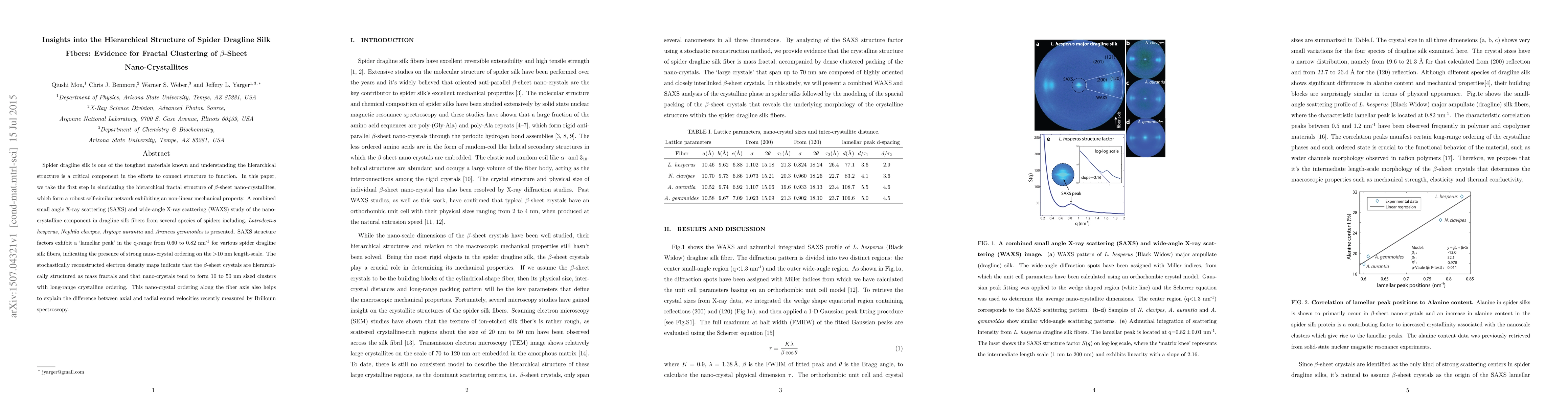 This paper elucidates the hierarchical fractal structure of $\beta$-sheet nano-crystallites in spider dragline silk fibers, revealing a robust self-similar network through combined SAXS and WAXS studies. The findings show a strong nano-crystal ordering on the >10 nm length-scale, indicating that $\beta$-sheet crystals form 10 to 50 nm sized clusters with long-range crystalline ordering.