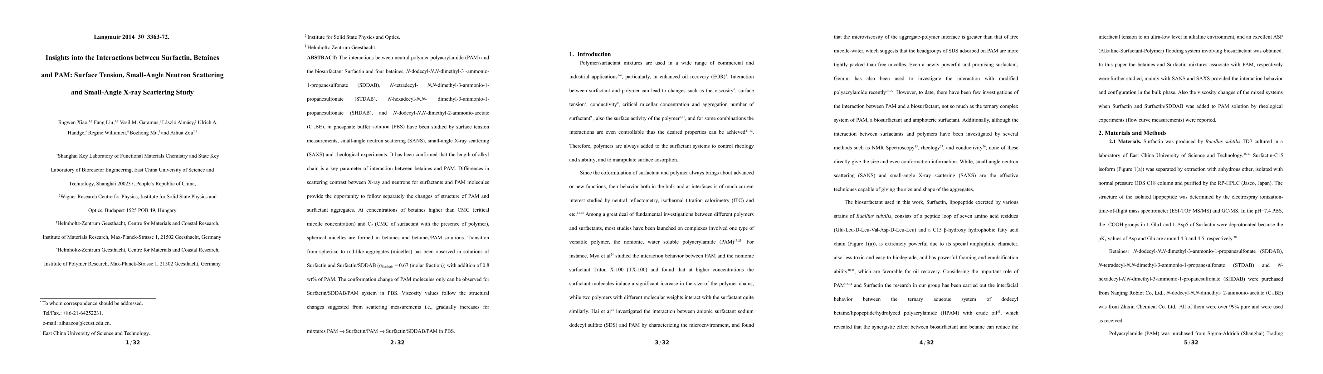 This study investigates the interactions between the biosurfactant Surfactin, four betaines, and neutral polymer polyacrylamide (PAM) in phosphate buffer solution using surface tension, SANS, SAXS, and rheology. The length of the alkyl chain in betaines significantly influences their interaction with PAM. SANS and SAXS reveal distinct structural changes in PAM and surfactant aggregates, with spherical micelles forming at high betaine concentrations. The addition of PAM induces a transition from spherical to rod-like micelles, particularly in Surfactin/SDDAB mixtures, and alters PAM conformation, correlating with increased viscosity.